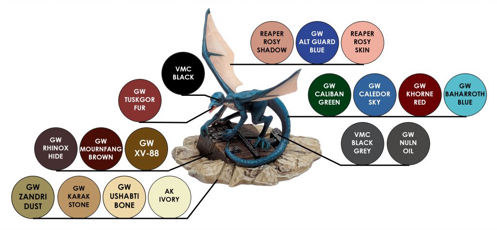 For the main coloring of the Bogwing, I decided on a blue-green. I gave it a basecoat consisting of a mix of Caledor Sky and Caliban Green. To shade, I mixed in Khorne Red and applied that to any recesses and shaded areas. I then added Baharroth Blue to my original basecoat mix and highlighted the skin with this mix.