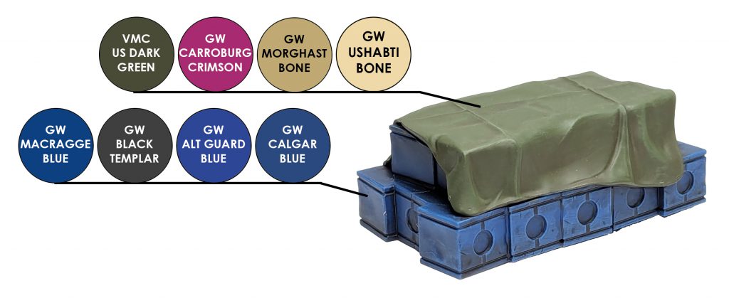The cargo boxes were primed Macragge Blue. I then used Black Templar and did a recess wash in all of the panel lines some shadows where the tarp lies. Once the wash was dry, I drybrushed them Altdorf Guard Blue and Calgar Blue.