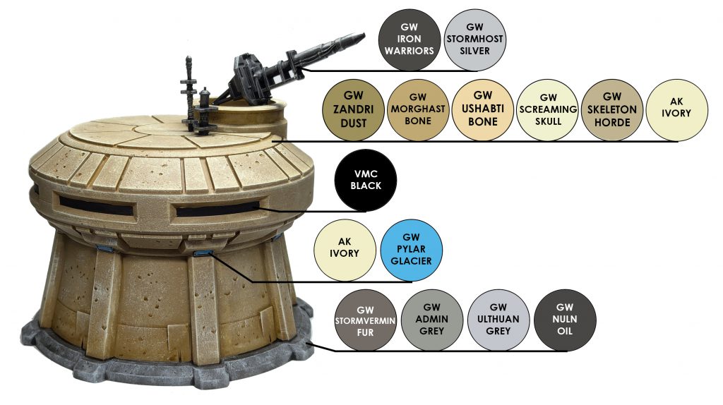 The gun emplacement and antennae were given a Chaos Black spray primer basecoat. They were then drybrushed Iron Warriors and Stormhost Silver.