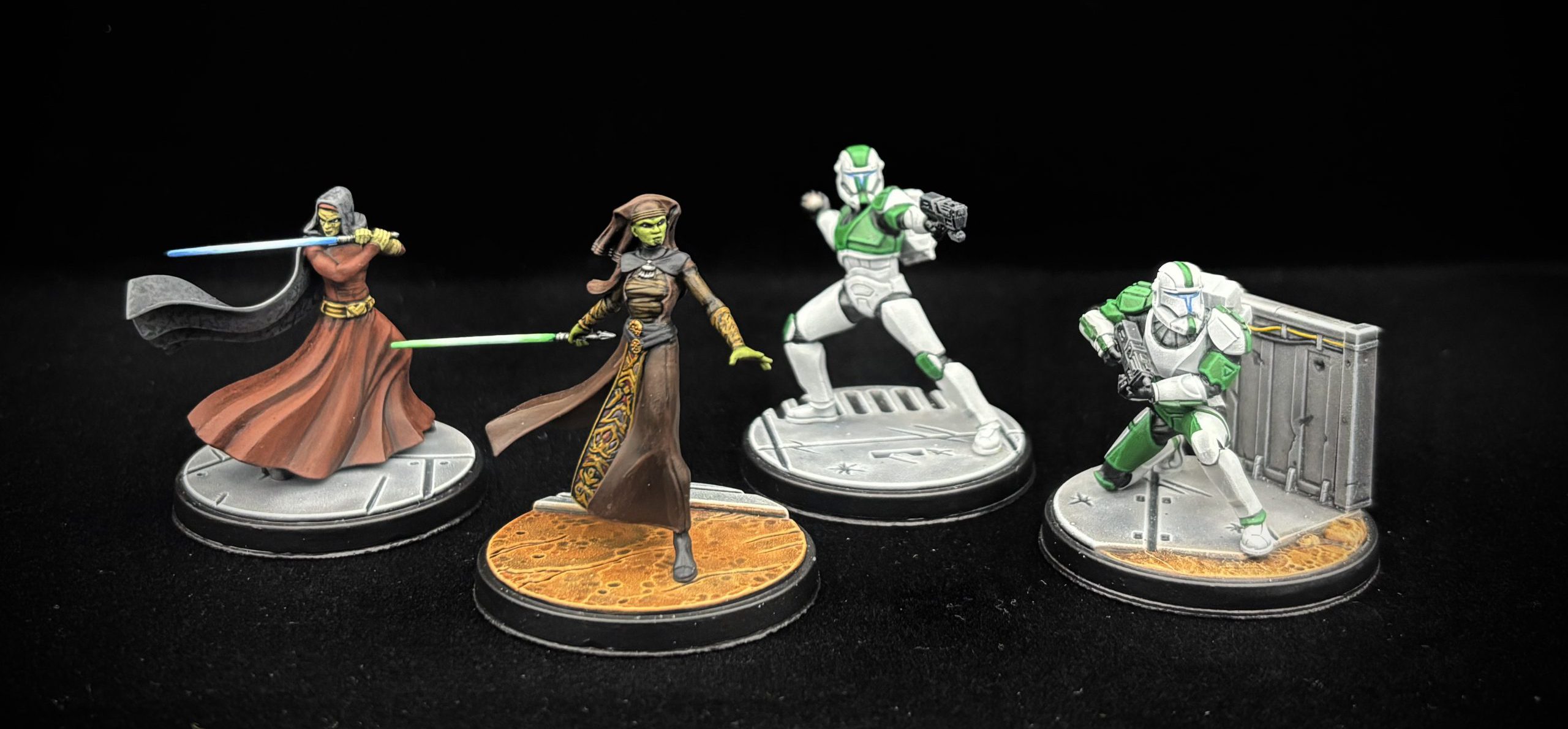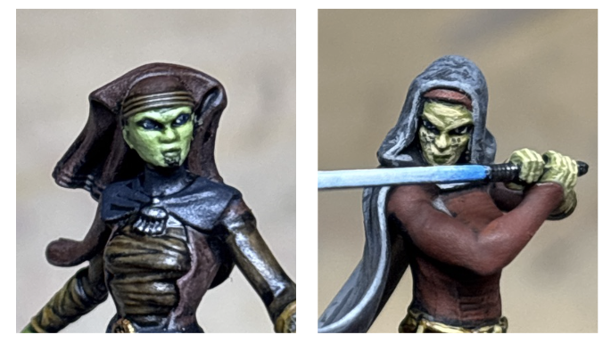 Tattoos: Both Jedi have tattoos that are an important cultural record of a Miralan’s accomplishments; Luminara’s on her chin and Barriss’s on her cheeks. Now, you could agonize over trying to use a microscopic brush to render these in exacting detail…but I didn’t. I used the same thinned black paint I used on Barriss’s cloak to put a trio of black diamonds on each of Barriss’s cheeks and to dot the pattern on Luminara’s chin and called it a day- the overall effect creates the look perfectly from the tabletop, and honestly trying to do more could end up making the model look too “busy” and detract from the overall effect unless you’re an absolutely ridiculous painter, at which point you don’t need my notes on how to do this anyways!