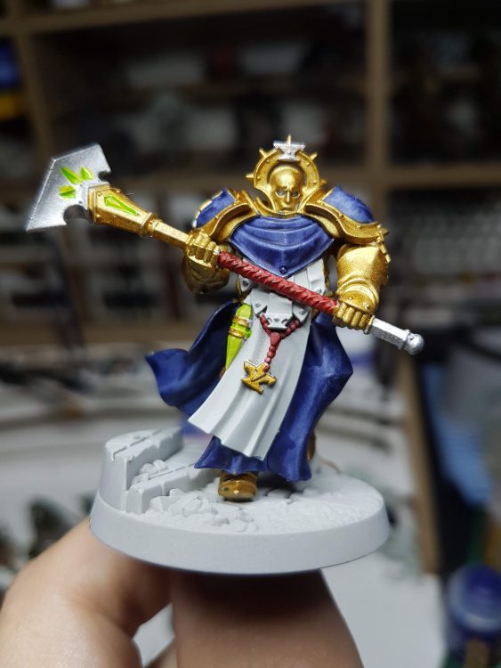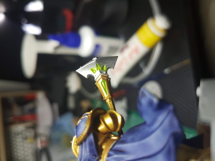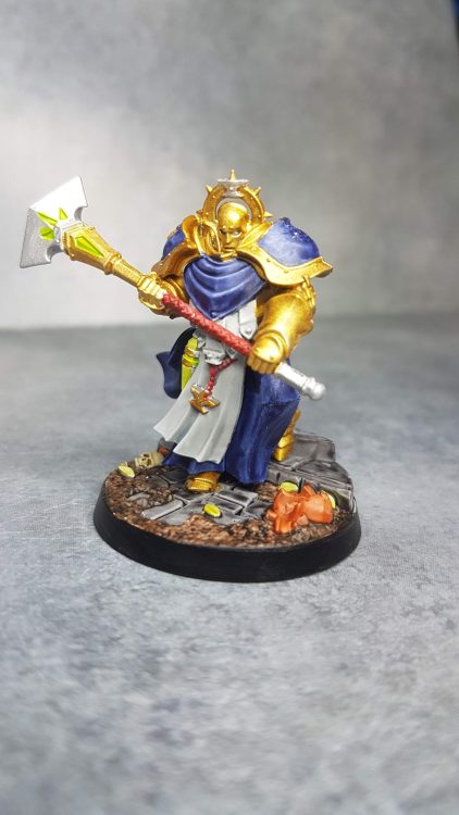 After that, it was Stormhost Silver and Contrast Flesh Tearers Red on the weapon, Contrast Ultramarines Blue & Contrast Apothecary White on the robes. I also broke out my favorite new paint, Tesseract Glow, and added it to the recesses on the weapon and crystal. Here I practically flooded the indents on the weapon and once it dried I ended up with this lovely effect.