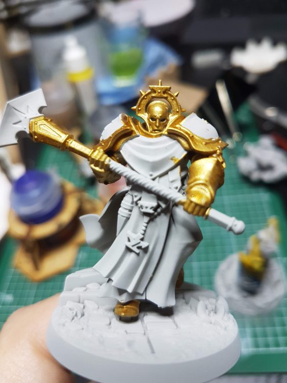 After settling on the Retributor Gold, I decided to smoosh it on all the armour pieces with a brush because I wanted too... it has nothing at all to do with the fact that the Retributor Gold Spray is an eye watering $50 dollarydoos. Plus Rob said I couldn't just spray and then dunk them in Nuln oil and call it done. Spoilsport