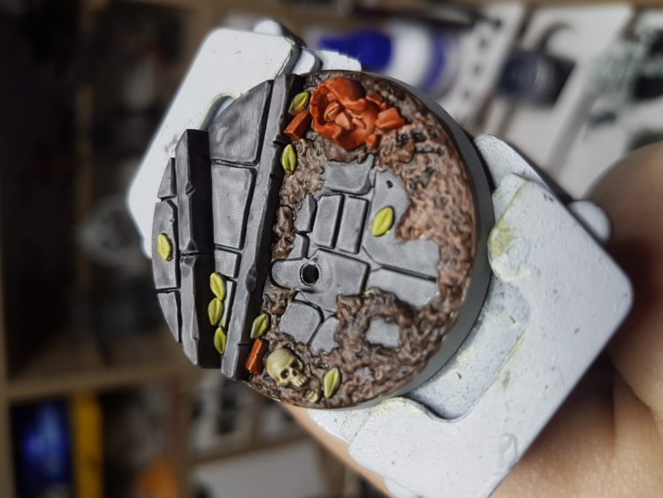 Here it was time to crack on with the base, I started off with Contrast Basilicanum Grey for the stone, a mixture of Contrast Guilliman Flesh and Contrast Wyldwood for the dirt, Contrast Gryph-Hound Orange for the pot, Contrast Skeleton Horde for the skull and Contrast Plaguebearer Flesh for the leaves.