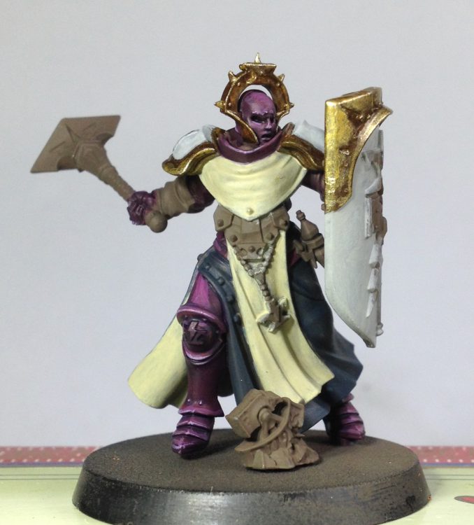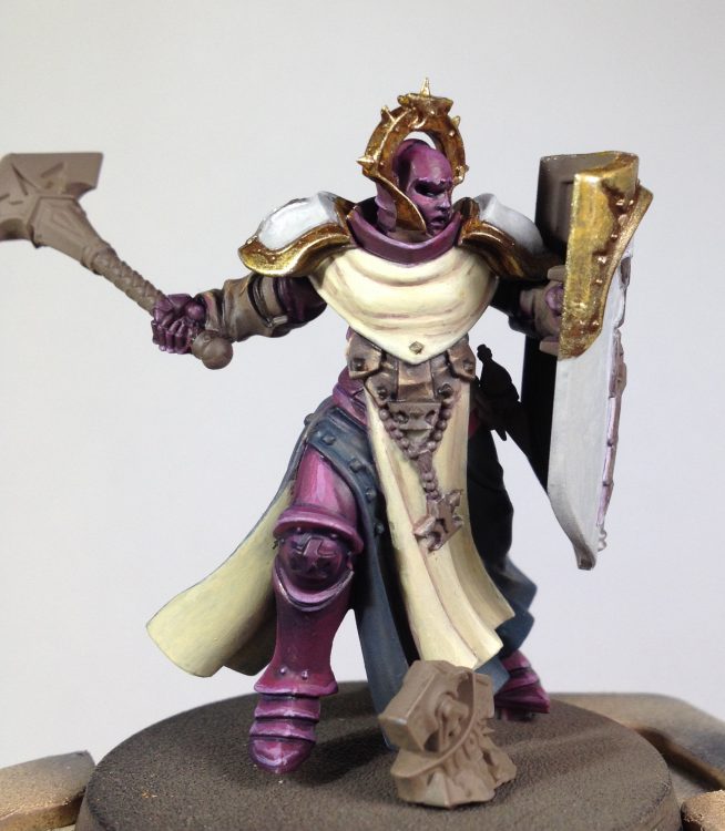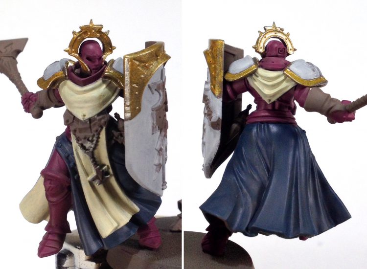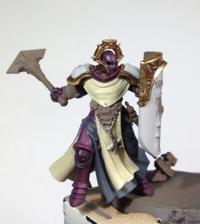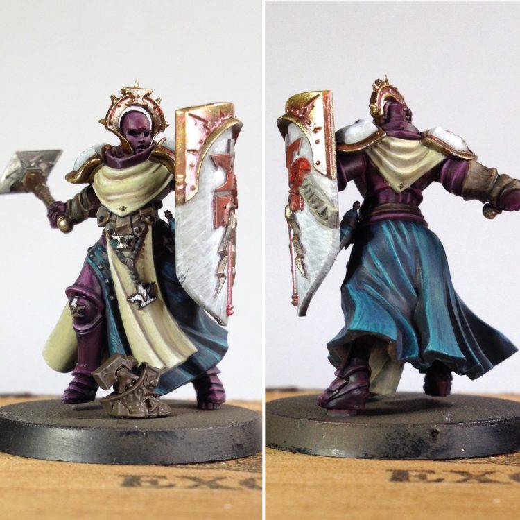 The whole model was primed with Stynylrez Ebon Flesh. Her armor is painted fairly close to the the painting guide in the Stormcast Eternals Battletome, starting with a base coat of Screamer Pink. The cloth and tabard are based with Ushabti Bone, and the robes with Incubi Darkness. The white parts of shield and pauldrons are Vallejo Dead White.