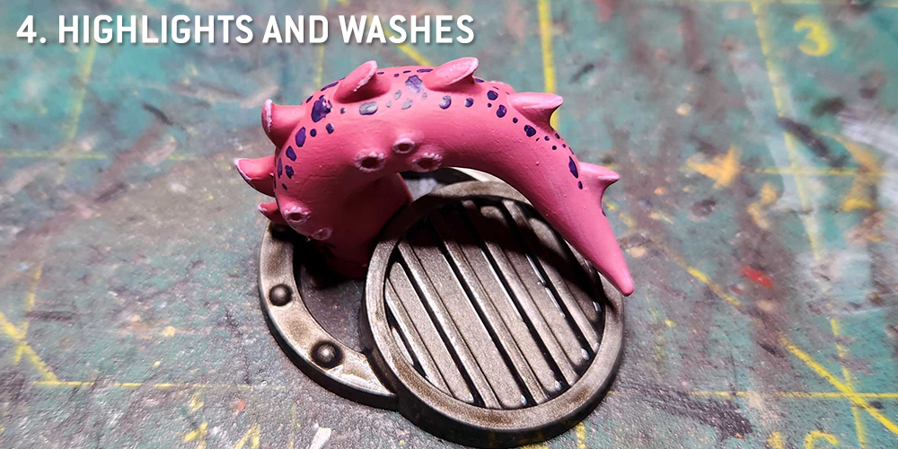 For the first problem, think about the angles the tentacle will be viewed from and work to highlight the raised parts of those angles. For the second, just go back to your initial thought of what color you wanted the tentacle to be, I wanted a purple tentacle so I highlighted purple. Specifically I used some of Citadel's