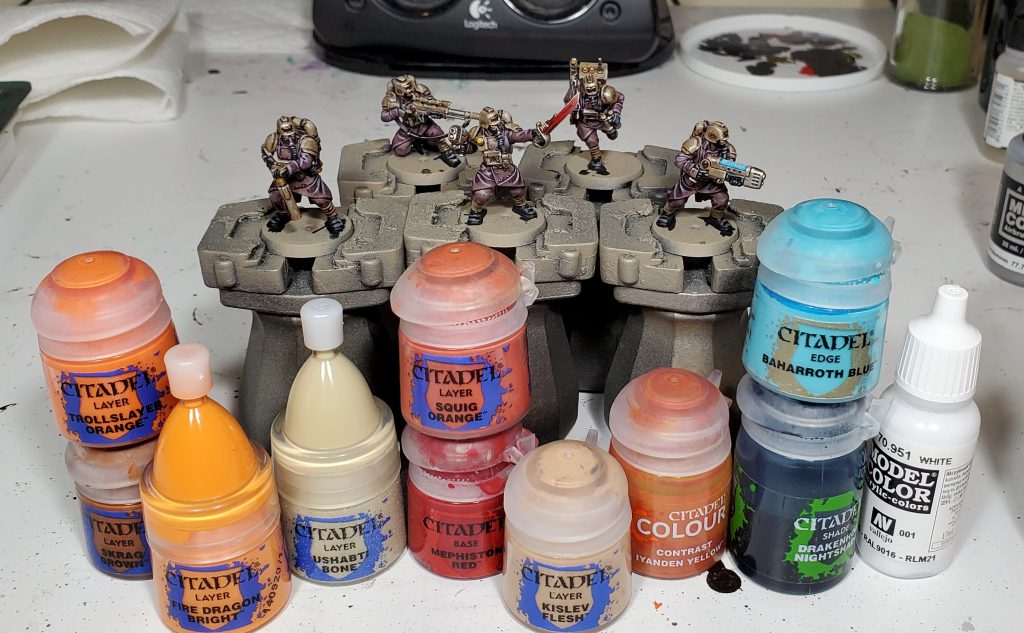 Red badges: Mephiston Red, Nuln Oil in the eyes and such, and Evil Sunz Scarlet highlights. With officers I tried to incorporate more red in sashes and such, painted the same way.