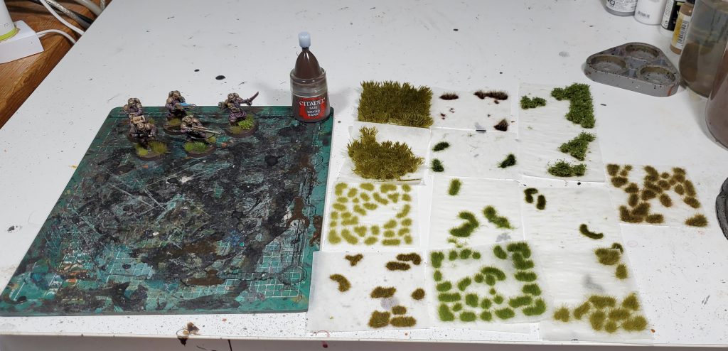 Drybrush the dirt with Steel Legion Drab followed by a lighter drybrush of Gorthor Brown (optional: do a final light drybrush of Ushabti Bone)