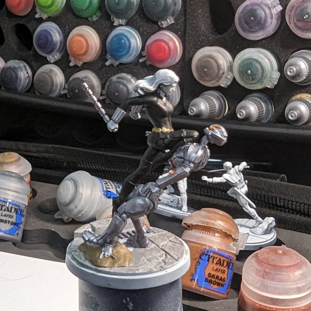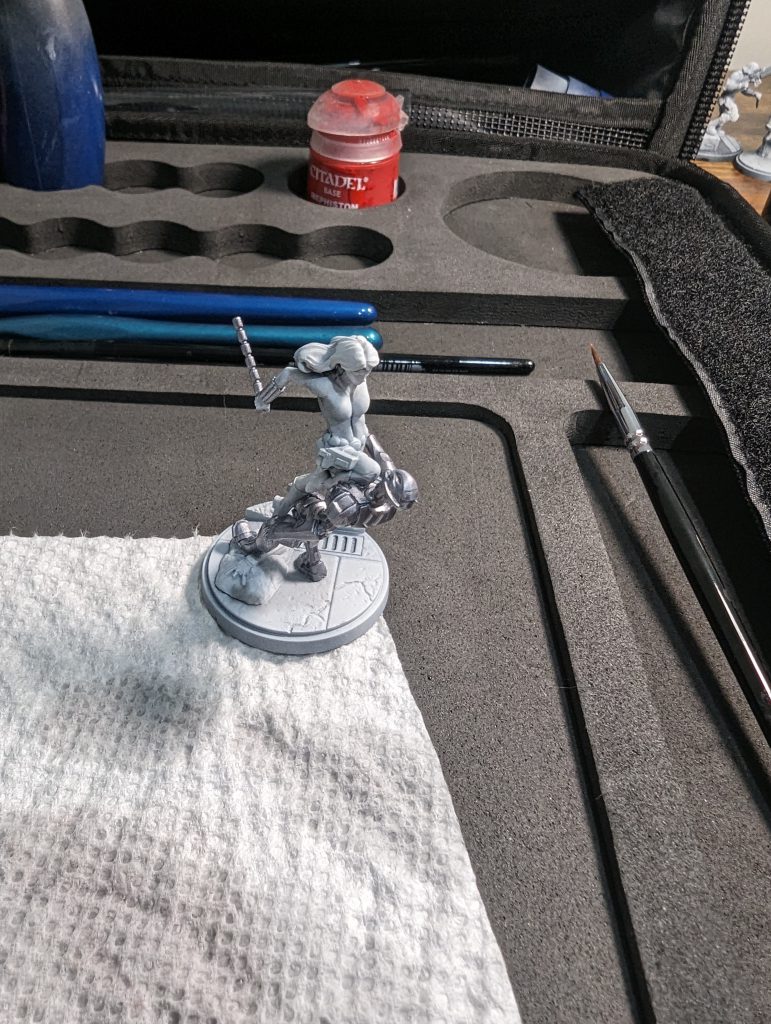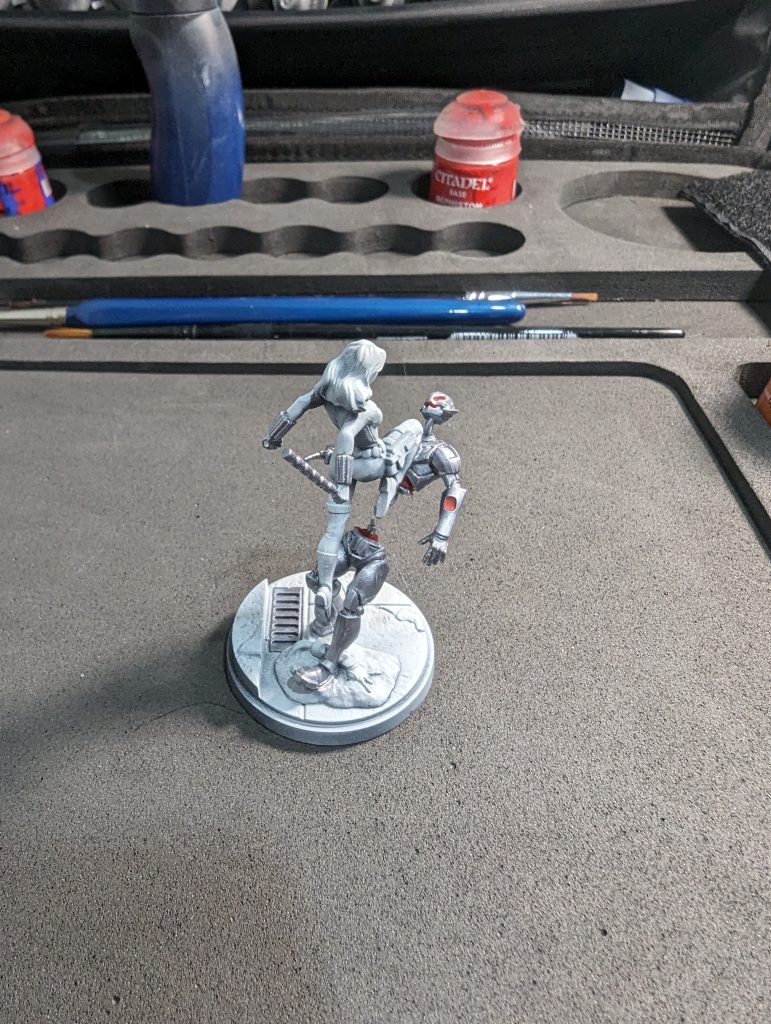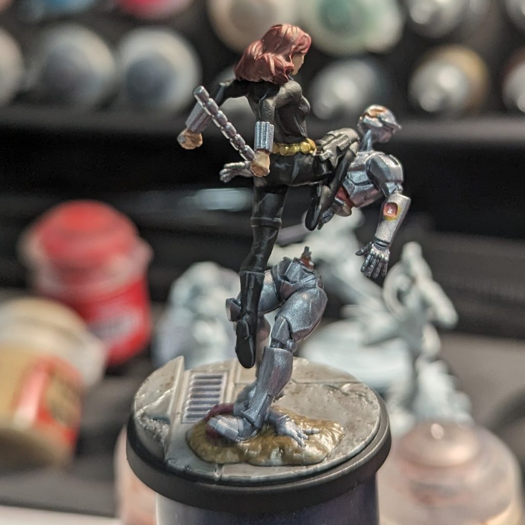 I started with a black prime followed by a white zenithal coat. I do this with most of my models. It helps accentuate shadows and highlights when using Citadel Contrast and Army Painter Speed Paints, and it also just helps my eyes not get lost in details being all the same color. Of course this runs of the risk of white patches being left behind if I miss a spot, but I prefer to have my mistakes be glaring so they’re easier to fix. I then used Army Painter Polished Silver Speed Paint on her batons, Widow's Bites (her wrists), and the Ultron Drone. I know I don't have the sewer grate and drone army painted in this image, but they also received Polished Silver as a base coat.