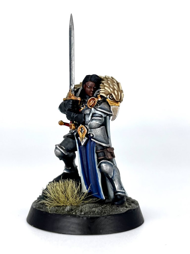Contrast Talassar Blue on the model so I went straight over the silver on the pauldron for a quick metallic sheen. After that, I splashed on some GW