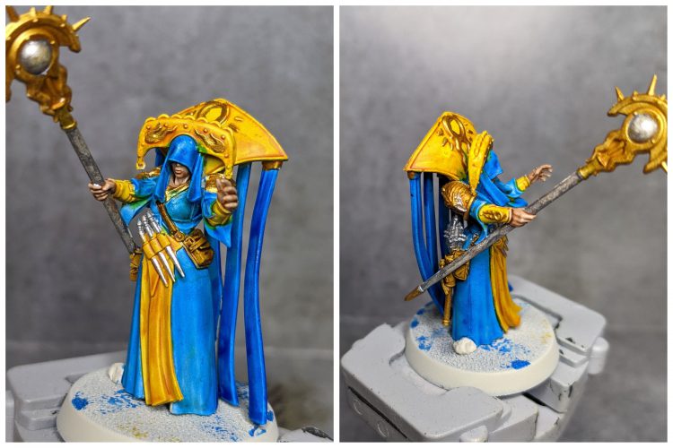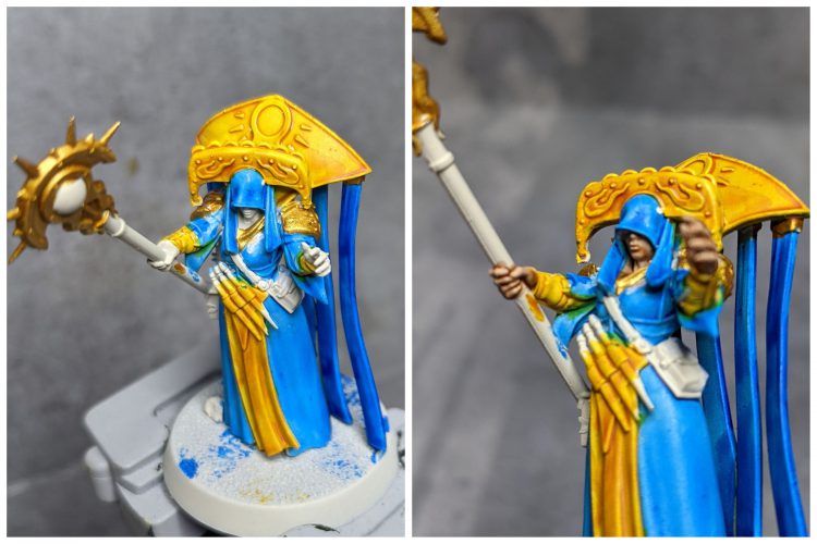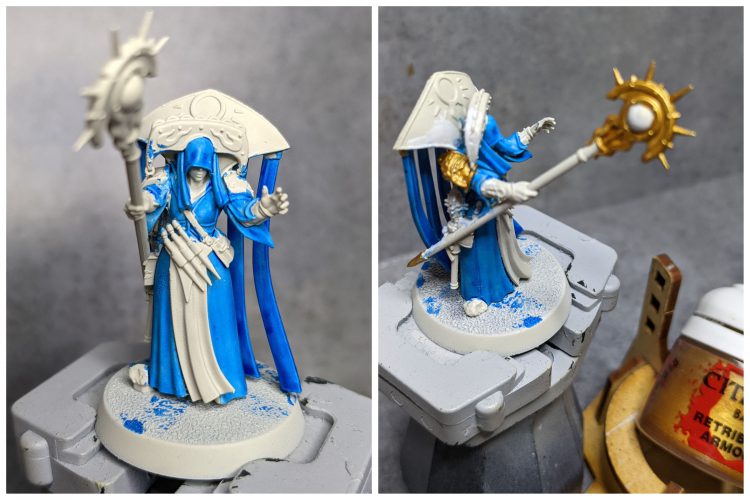 - Add a little Ulthuan Grey to the Celestra Grey and layer up, leaving the darker color in the recesses