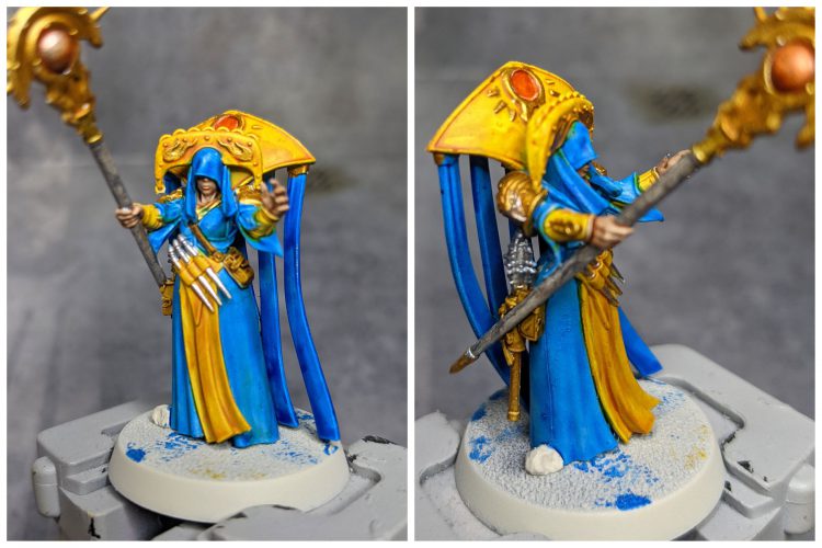 Contrast Talassar Blue as a spot colour somewhere on the model and Cleona Zeitengale seems to me as one of the more good Good Guy, I decided to make the bulk of her cloth blue. After that I busted out some