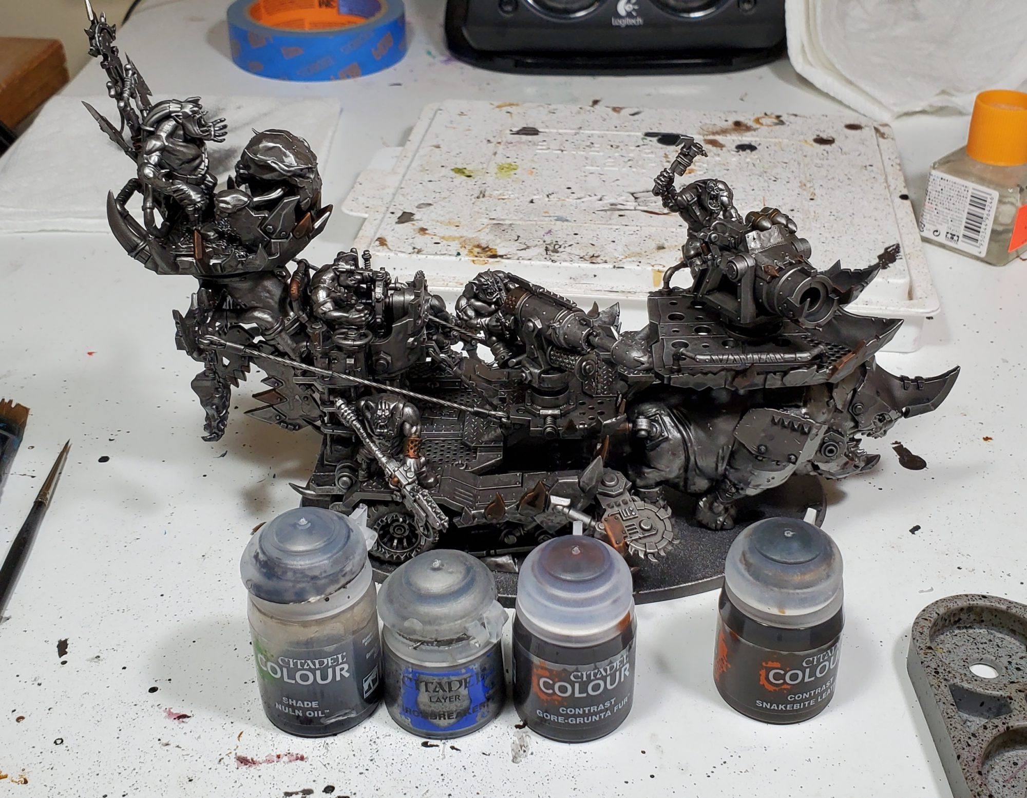 I don't really feel like doing a bunch of work on the absolute ton of metal on this model, so we are gonna leverage contrast to make it a bit more lazy. I started with washing all the metal in Nuln before a heavy drybrush of Ironbreaker, after that I picked out copper with Gore-grunta and brass with Snakebite. Neither will be super bright, but the drybrush mostly shows through and it saves a LOT of time, which we will need for the rest of the paintjob!