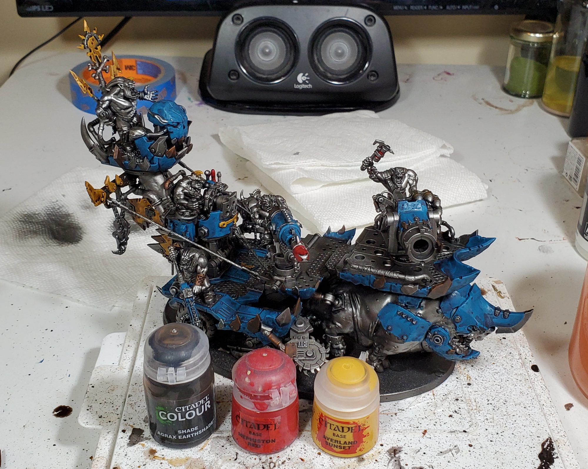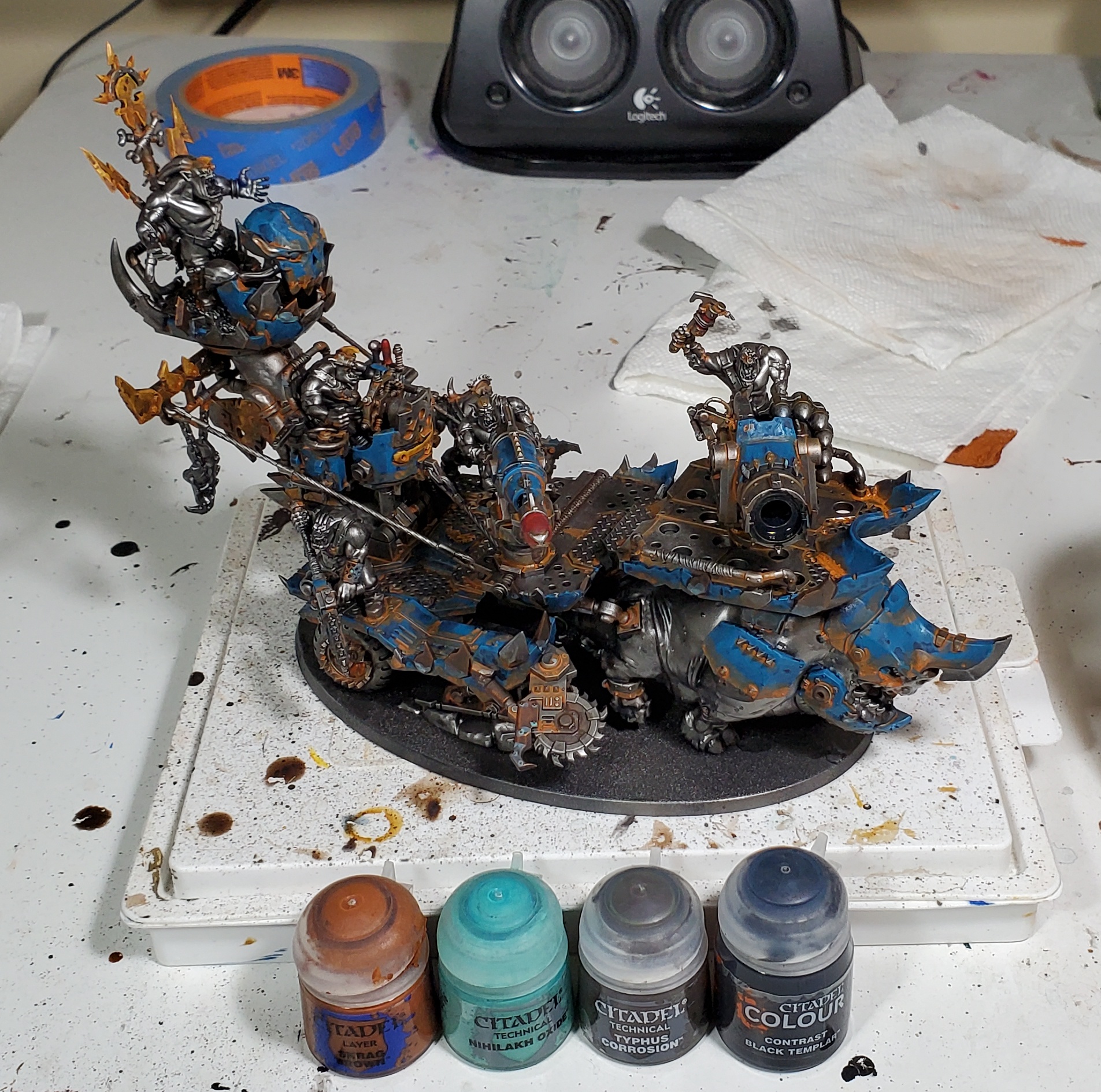 I like heavily watering down Skrag to use as rust, it works really well with the blue armour plates I think! I usually thin the Nihilakh before applying it to coppery bits, but it would work fine straight out of the box. Typhus is great for anything gross and oily, and can pull double duty with a coat of black templar changing it into heavy soot.