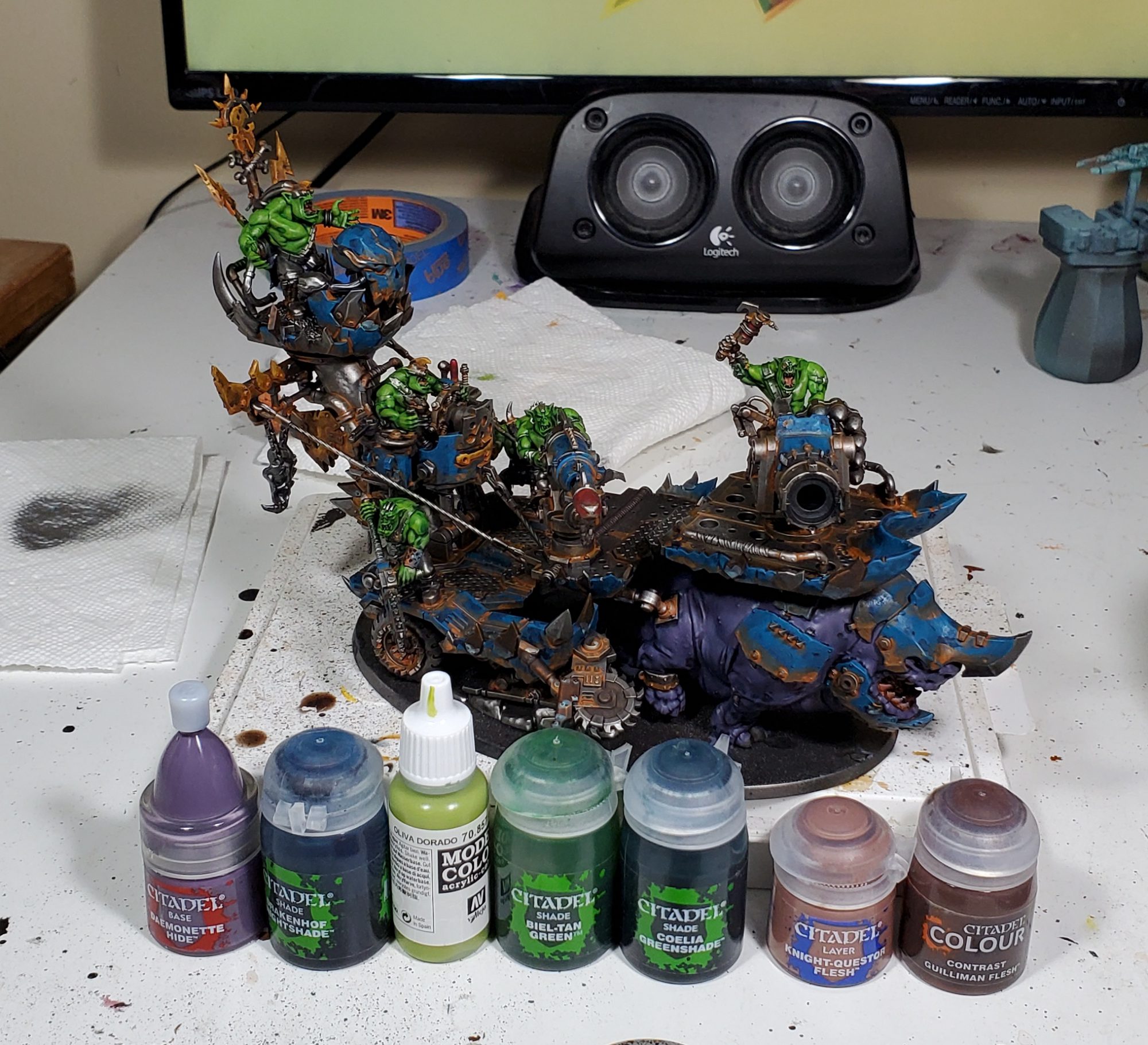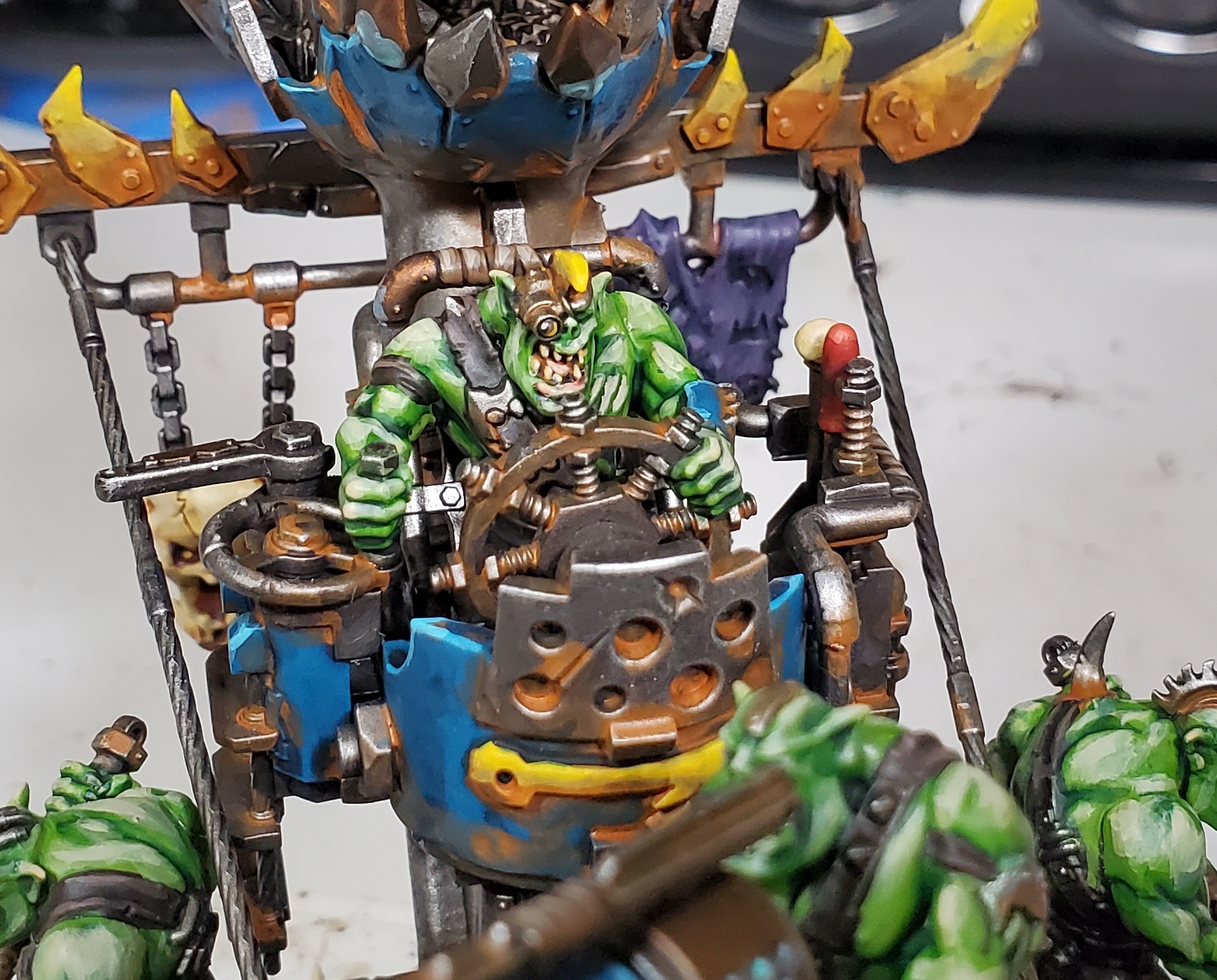 This is mostly straight forward, purple washed blue for the squig and a light flesh tone for the mouths. The ork skin starts with Golden Olive before it is then washed in two ways, once all over with Biel-tan and then the extreme recesses get Coelia to push them a little darker.