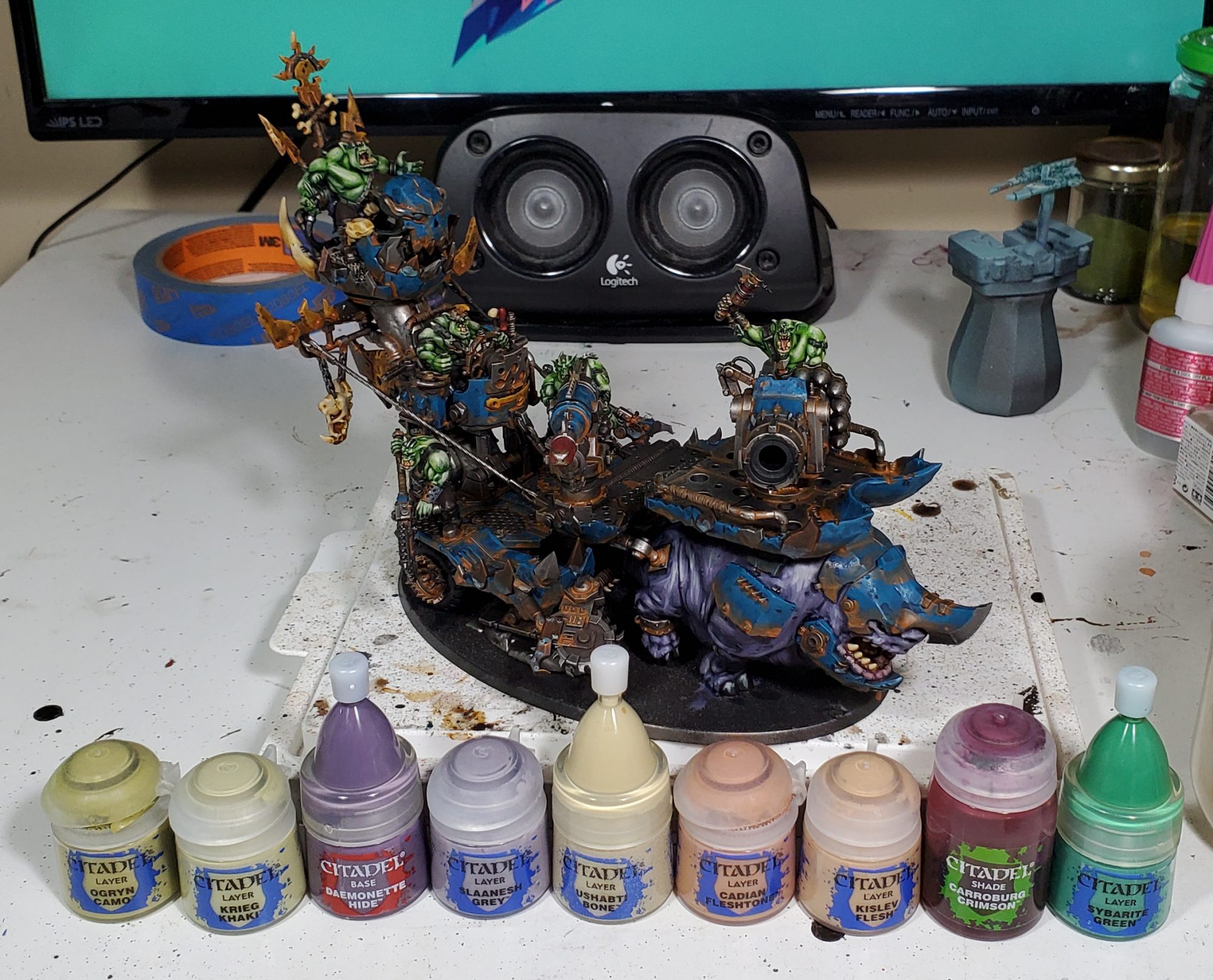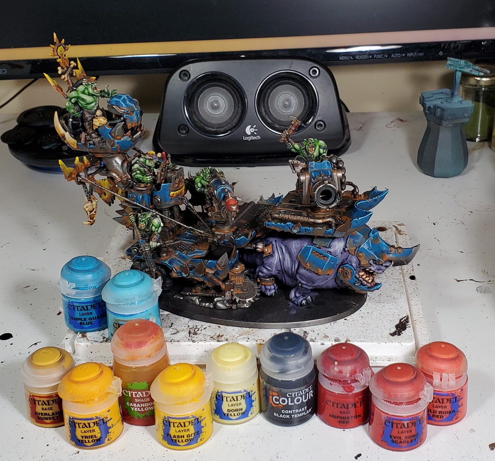 The glowing bulb is essentially just the middle three colours where I base in Skrag and stop the lower right crescents at Flash Gitz and use Dorn for the opposing 'reflection'.