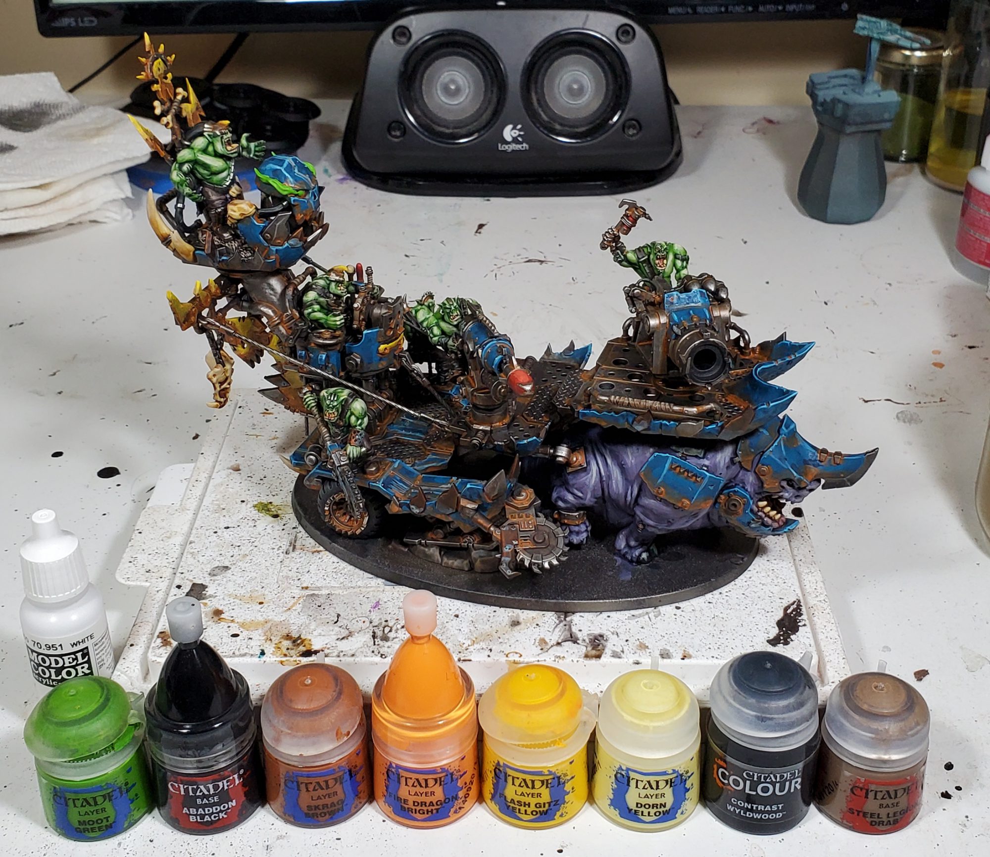 The eyes won't quite make sense until you realize they are just the same as the highlight colours used elsewhere. Squigs have eyes of Yriel washed Casandora then highlighted Flash Gitz and Dorn with pupils of black templar, where as the Orks just get Mephiston as I find more complex eyes can look really weird on them.