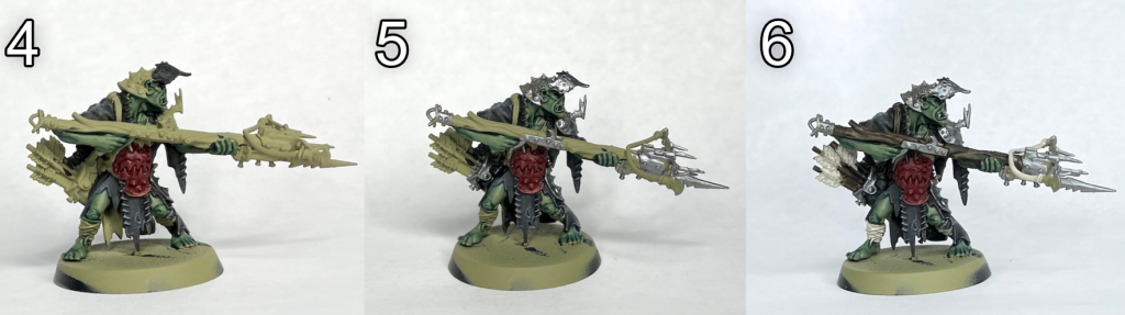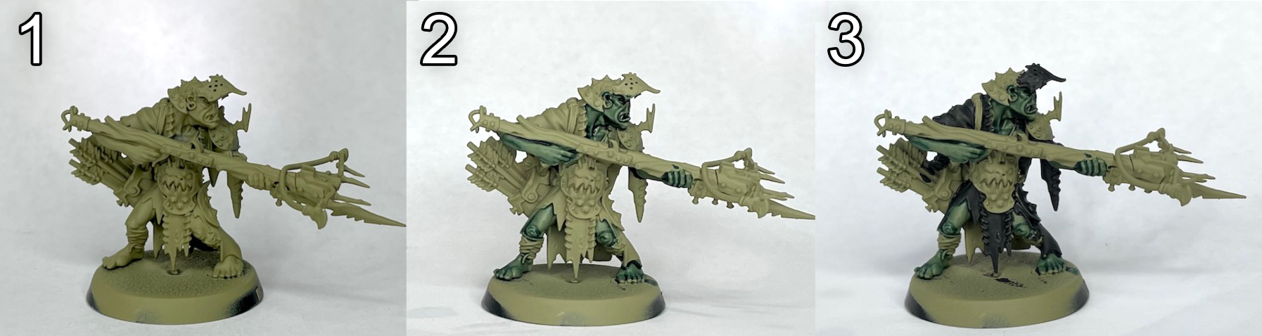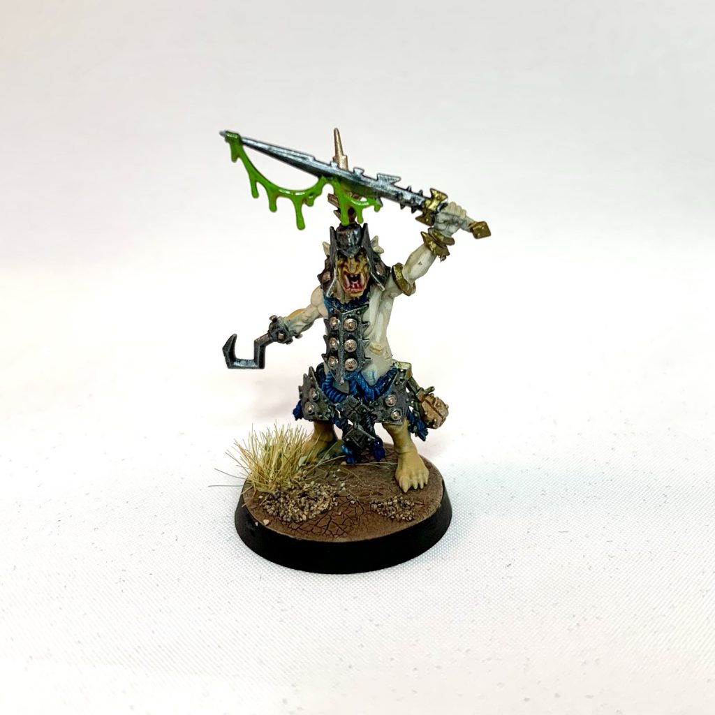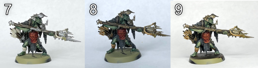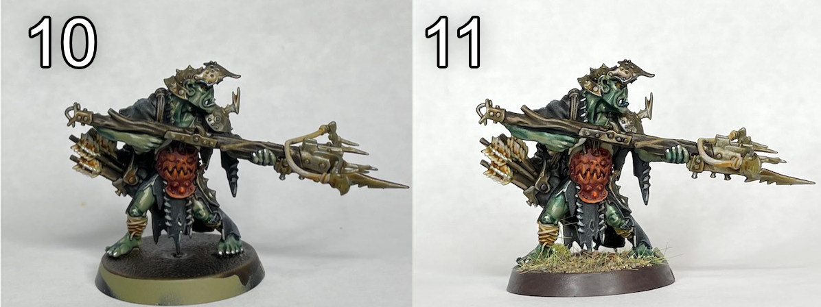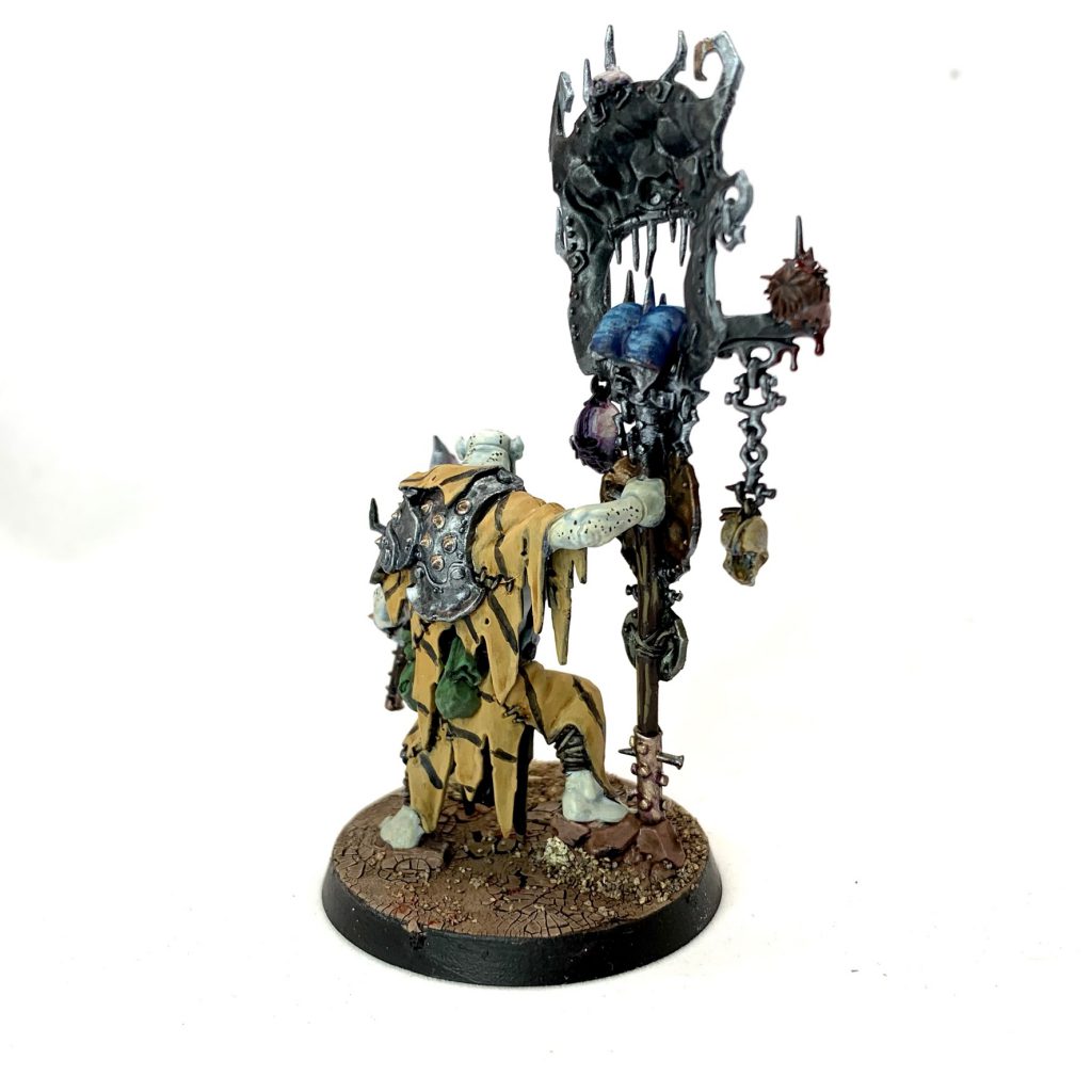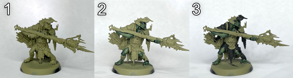 - Highlight flesh with thinned Citadel Death Guard Green and the off-white areas with Citadel Karak Stone.