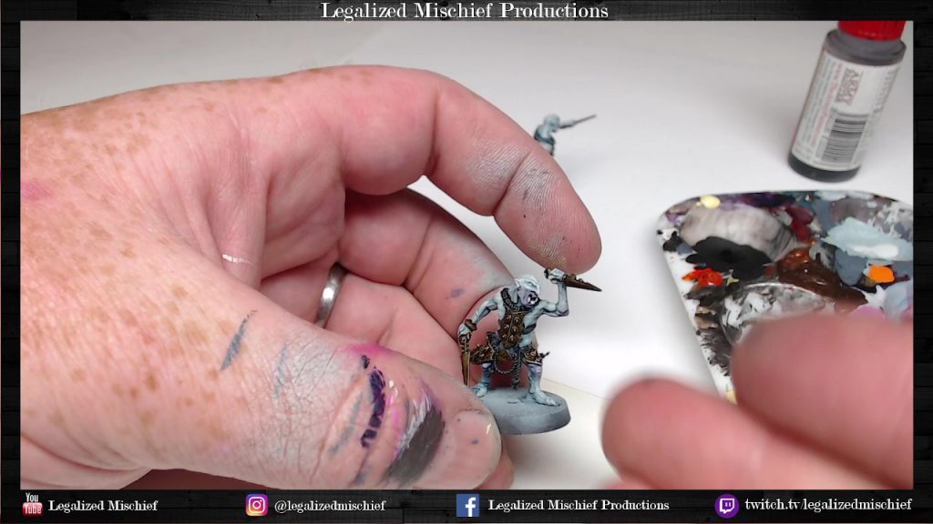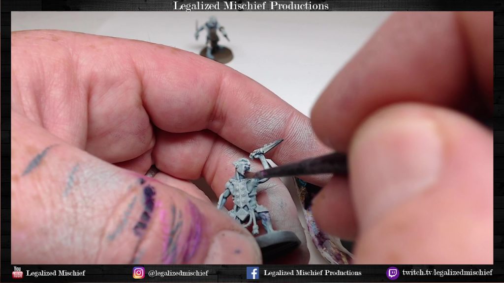 - Highlight face, elbows, and knees with Vallejo Model Color Silver Grey. This helps to integrate the purple into the overall skin tones