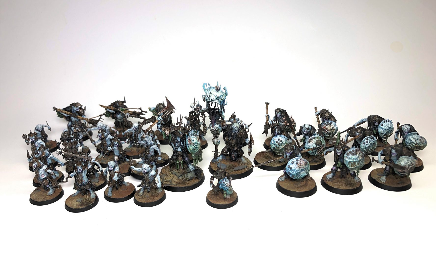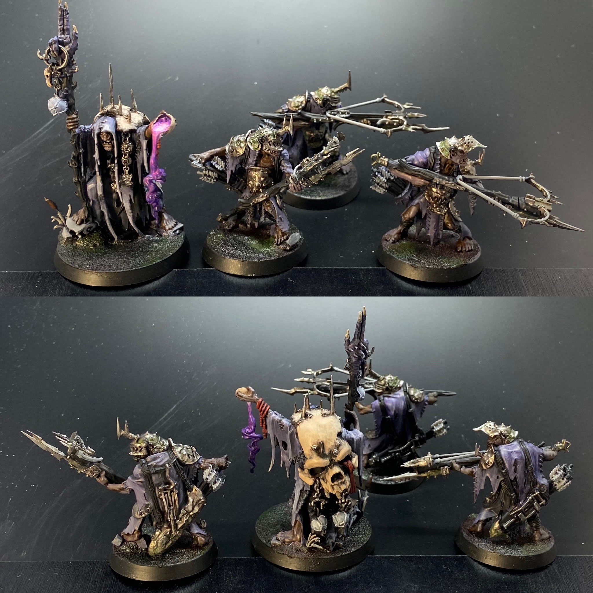 The bases were GW texture paint, that after the overspray from the original airbrushing, were washed with the same dull green I used on the metals, spotted washes of Vallejo dark green, some additional browns pushed around the edges of the greens and then all washed with GW. Nuln Oil "Gloss" to give the ground the damp-swamp feel.