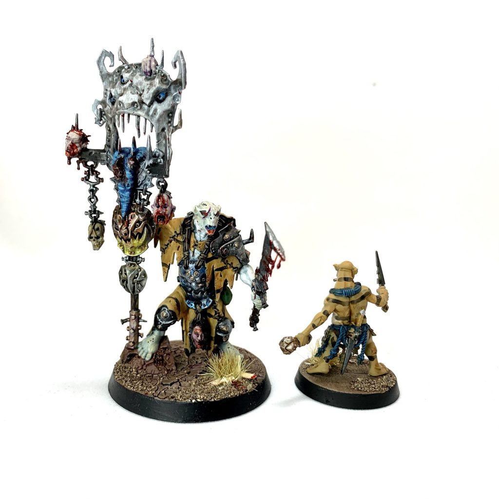 As I mentioned above, my Krulboyz hero scheme is based on the Blue-Tongued skink. Initially I was going to carry the blue spot color motif forward onto the heroes, but ultimately decided that that didn't make as much narrative sense. The Hobgrots are subservient to the larger Kruleboyz. Instead, I decided to carry the Hobgrotz skin forward as the leather worn by the hero. It's a vicious society and any Hobgrot that steps out of line is turned into hides.