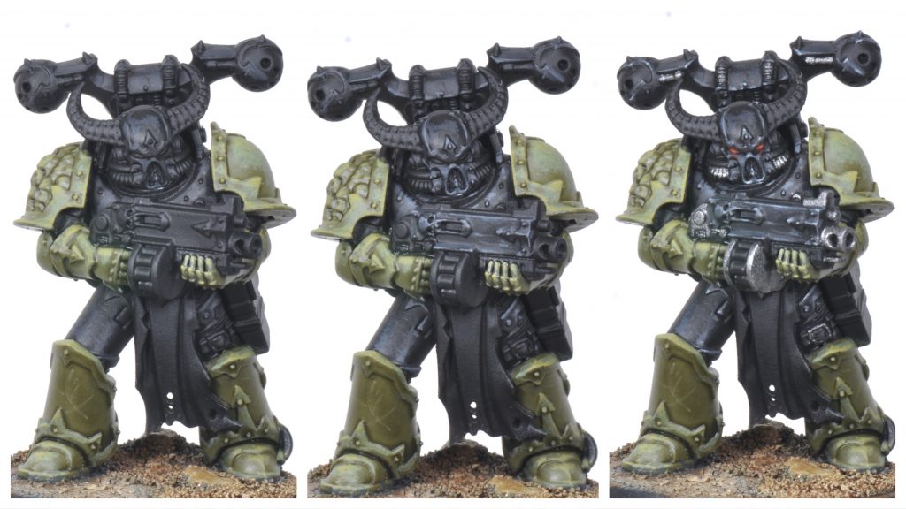 The Purge have green armor on the greaves/feet, shoulder pads, and helmet, with black everywhere else. You can go richer on the green, but I chose to go with something similar to my Death Guard, so I basecoated those parts with