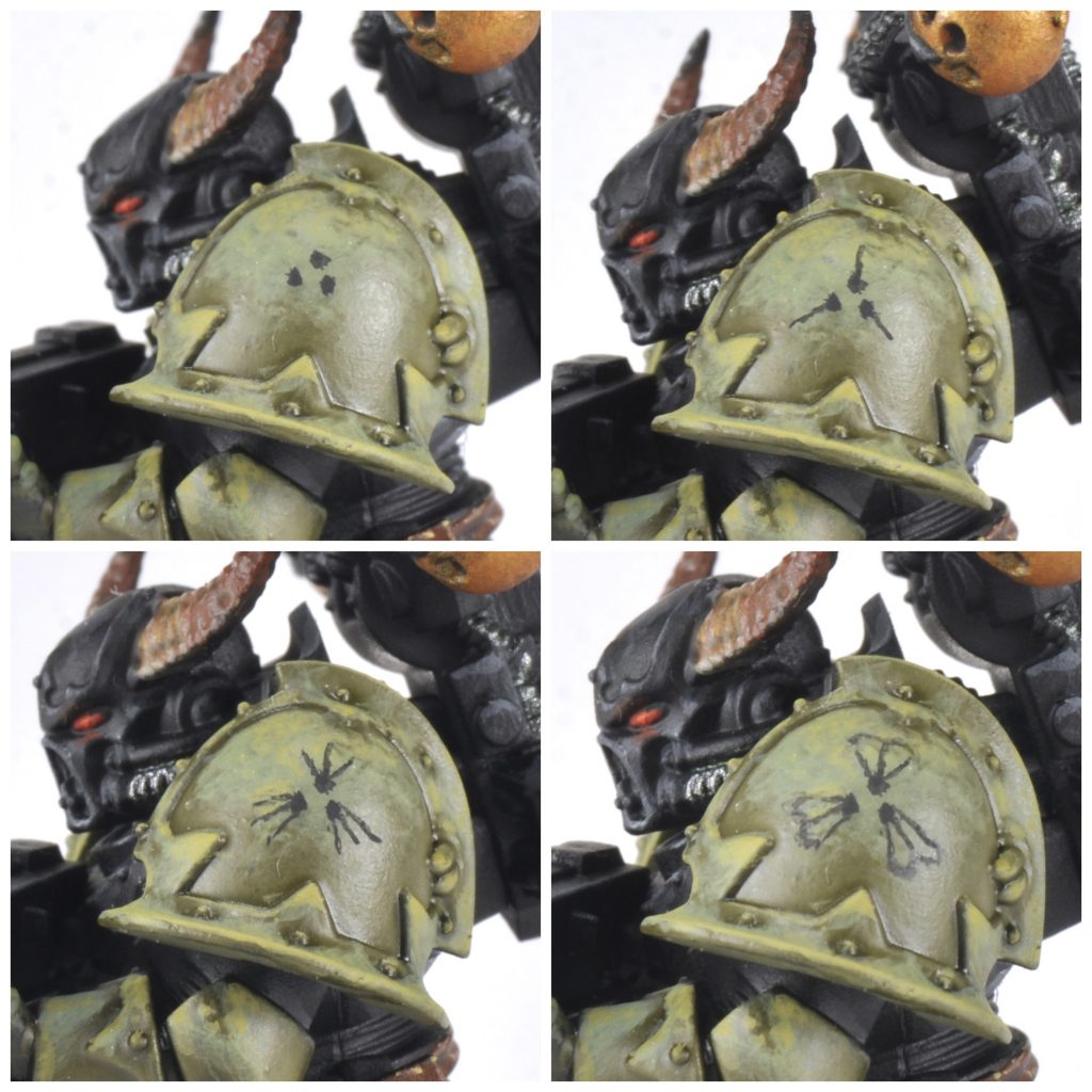 That pretty much finishes off the model. I freehanded the icon on the shoulder using Black Legion Contrast paint, basically doing the same thing Skails did - start with the three dots, draw the lines from those, then finish off the wing shapes.