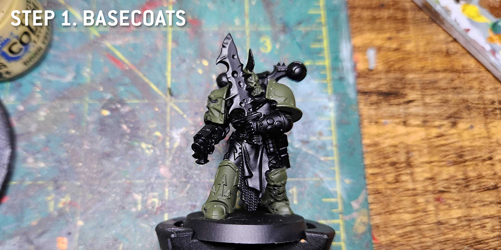 Castellan Green. I also lay down the basecoats for the black armor at this stage, highlighting with