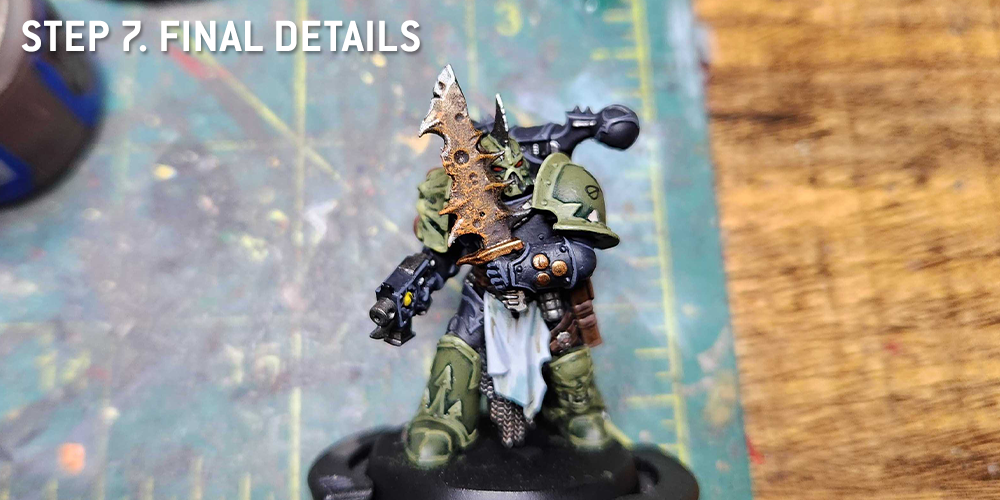 Time for some final details. I paint the cross guard on the knife and the Nurgle mark on the vambrace with