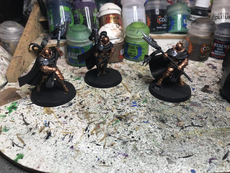- The halberd hafts were Mournfang Brown > Cygor Brown, followed by a wash of Carroburg > Agrax.