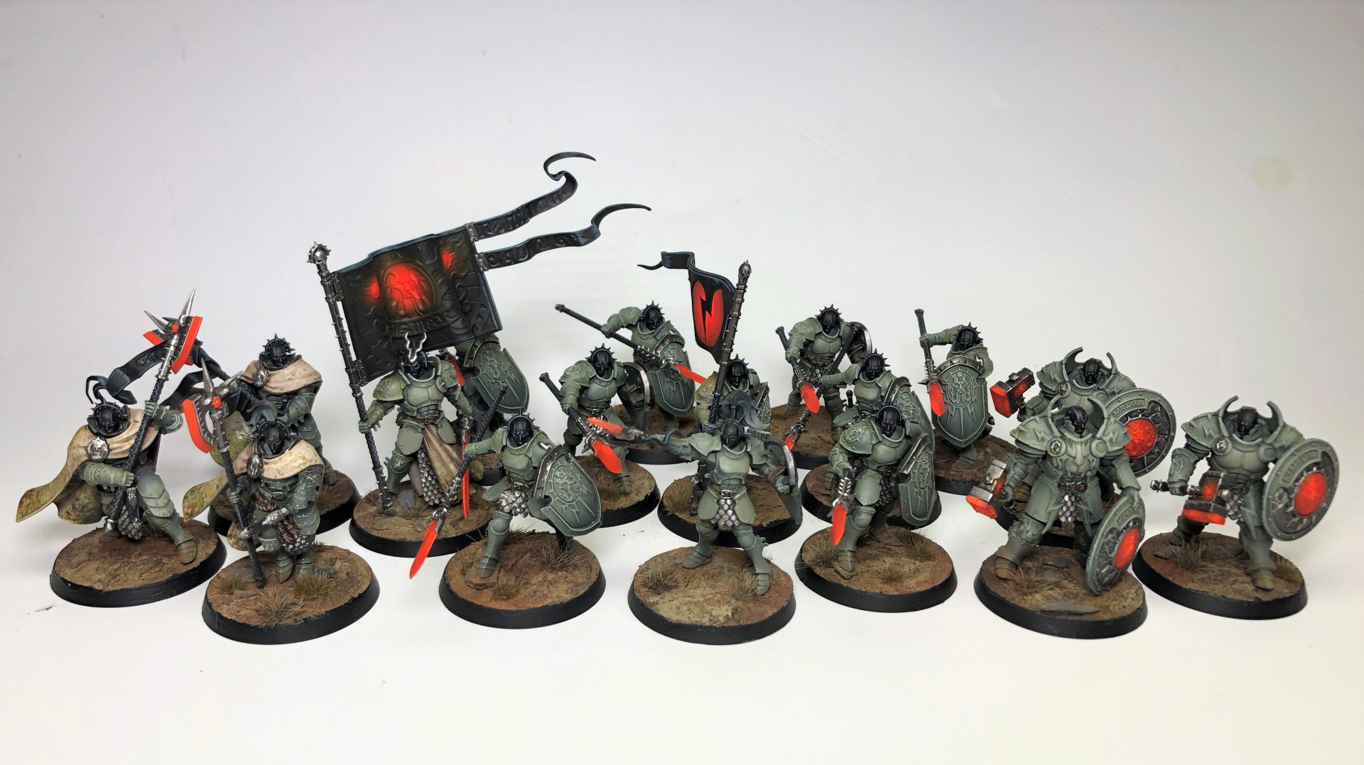 I knew I wanted to paint the Stormcast Eternals in a more natural tone, to compliment the Kruleboyz in the other half of the box. I really like this green grey that I typically use for stone, so I decided to try it out on the Stormcasts' armor. To give them a mystical/magical element I opted for a very strong Orange glow for their weapons and banners. The black helmets help to anchor the scheme, and also speak to their lack of humanity after countless reforgings. Overall I really enjoyed painting these and am looking forward to finishing off the rest of the characters!