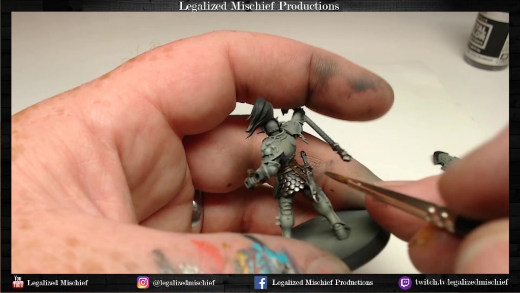 - Drybrush a 2:1 mix of Vallejo Model Color Ivory and German Grey, focusing on the chest, shoulders, arms, and knees