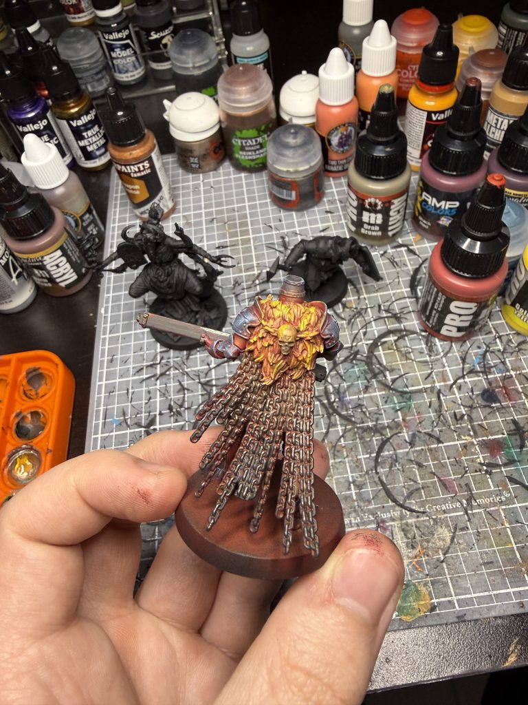- One neat trick to the Hellfire is also to use an Orange contrast like Magmadroth Flame to already have a pre-thinned glaze you can use - I use this to add some slight OSL to the fire near weapon blades.