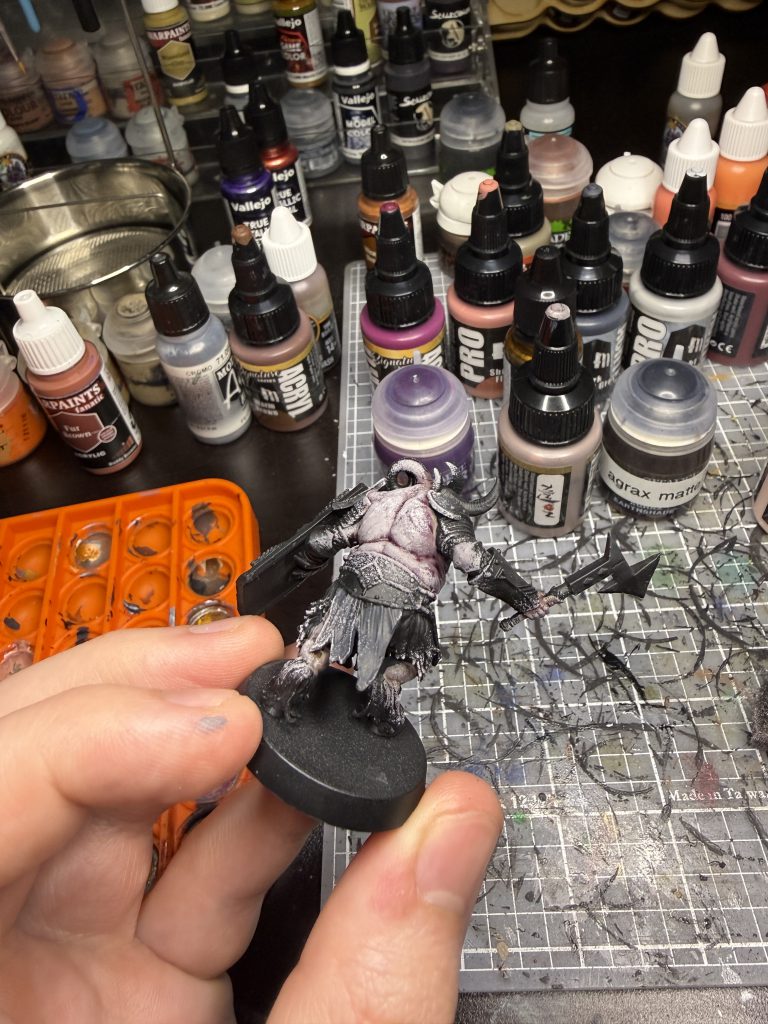 I depart from sponging for this, mostly due to how the musculature is more defined on the Sorcerer I used for an example here. If you prefer to keep doing that or drybrushing, go for it. You can use the same paints and achieve a similar outcome. On the flipside, you can do cleaner blends for a much smoother look -