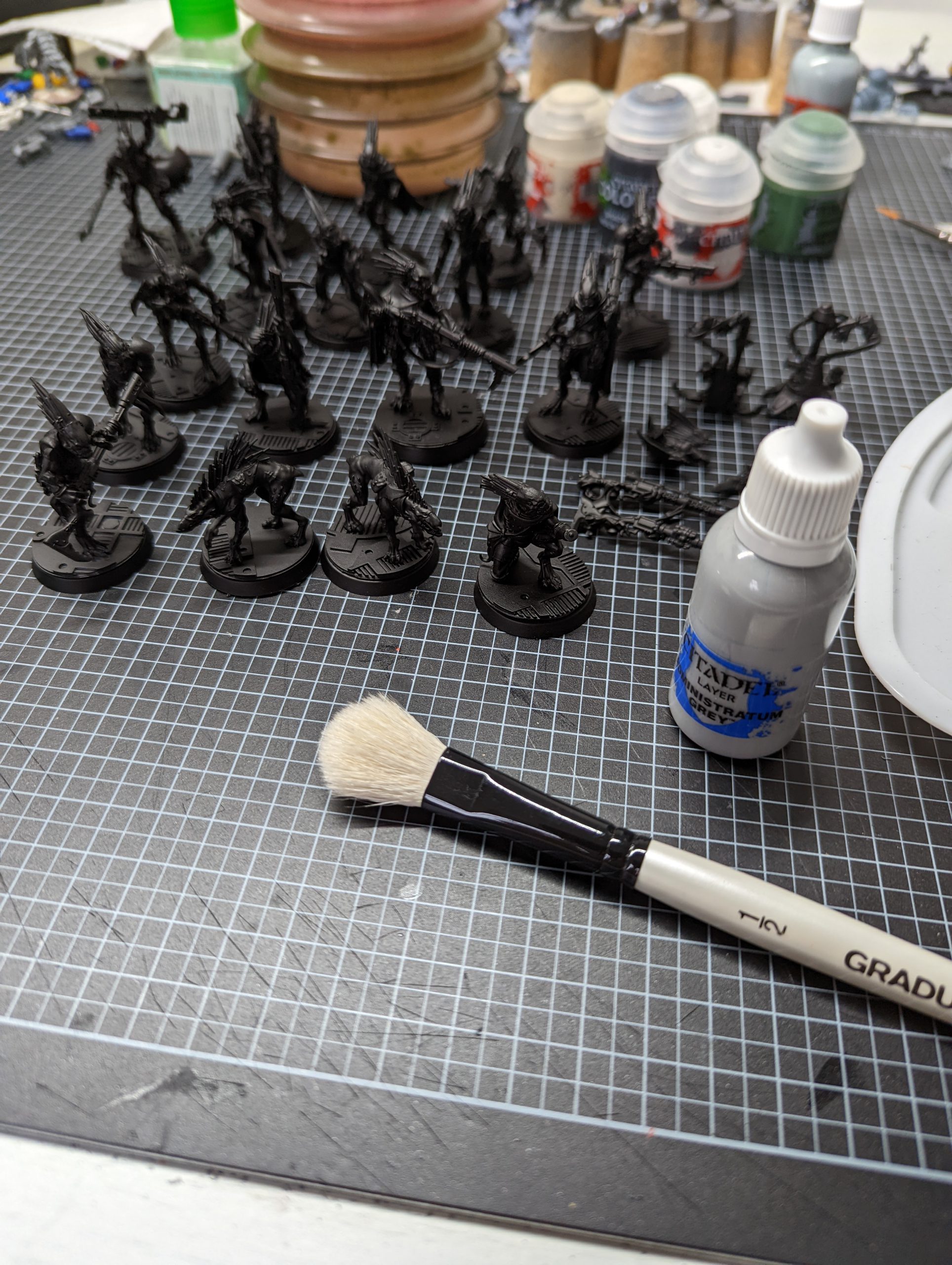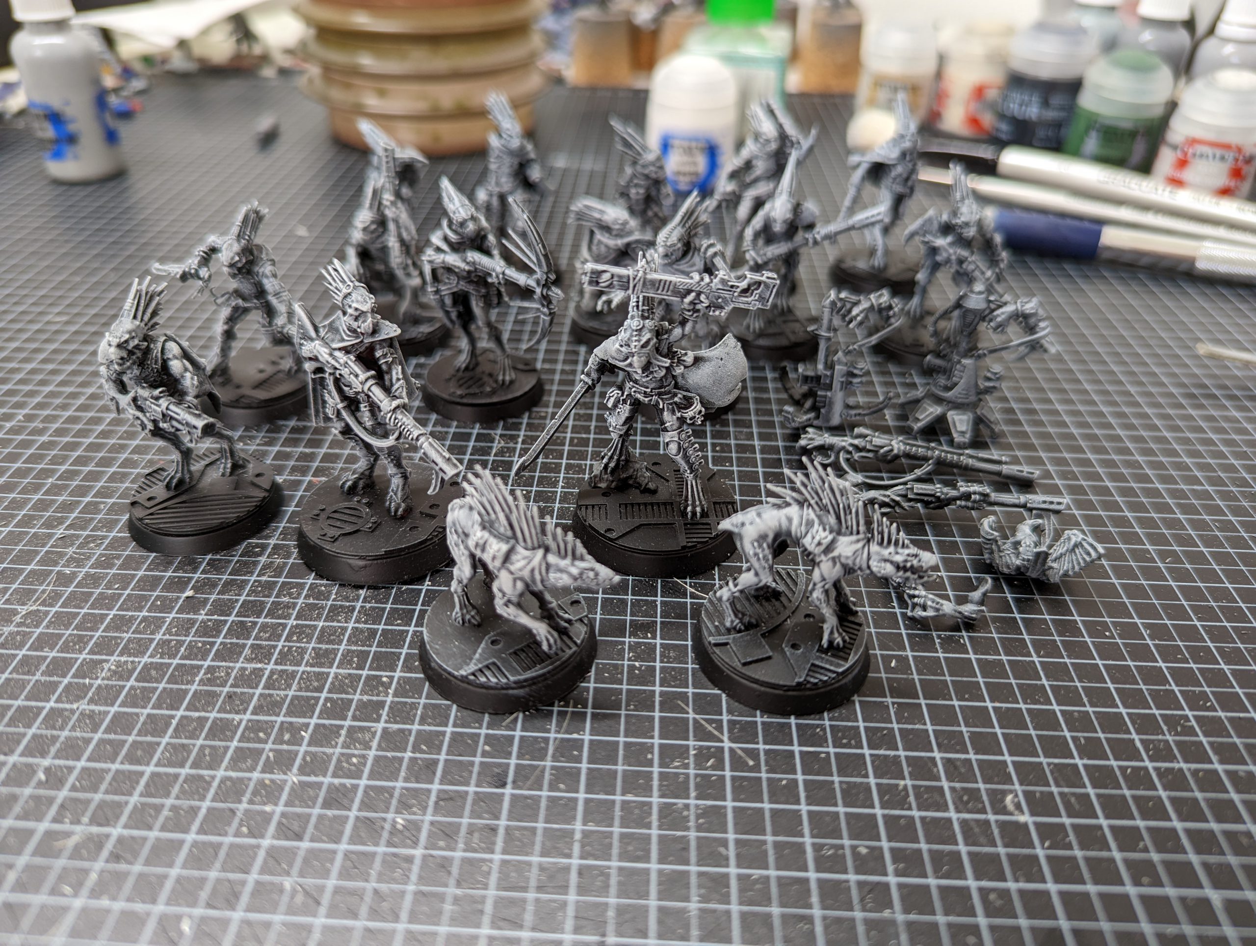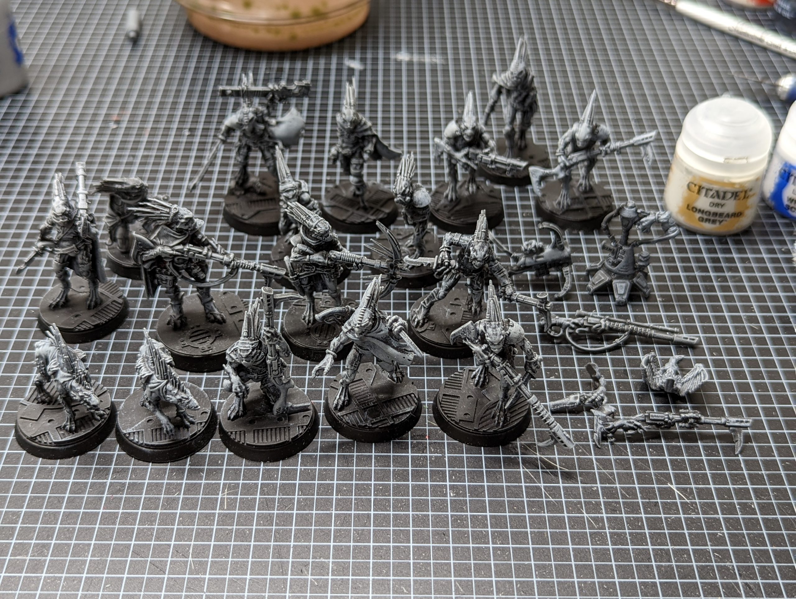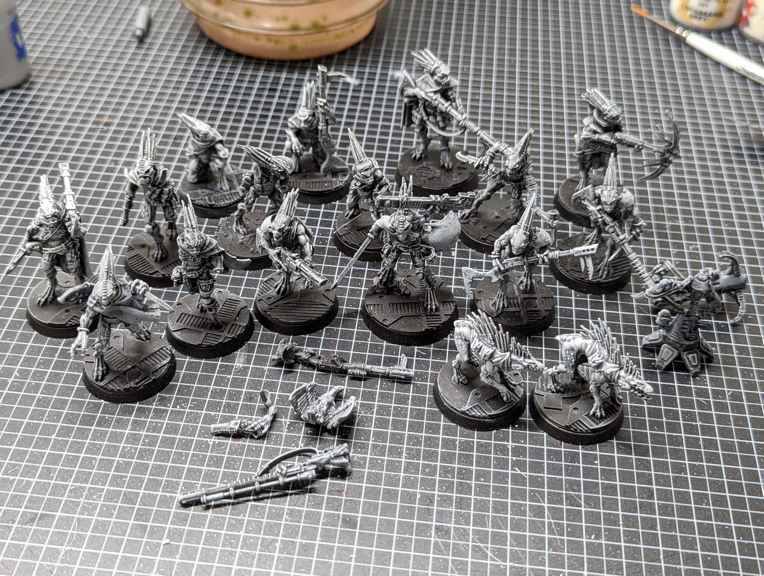 I was fortunate enough to get some Kroot from the Into The Dark box, and I wanted to underpaint these with a grey to white grisaille. I assembled all the models (17 in all) to give an almost complete roster, and worked out the necessary sub-assemblies where required. I then based the models and sprayed them black.