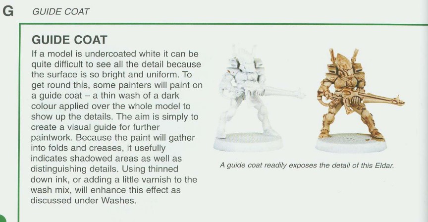 If you read the ‘How to Paint Citadel Miniatures’ book from Games Workshop which came out relatively recently (ok checking that 2003 I’m like that guy out of Indiana Jones) then on page 38 this technique is referred to as a Guide Coat.