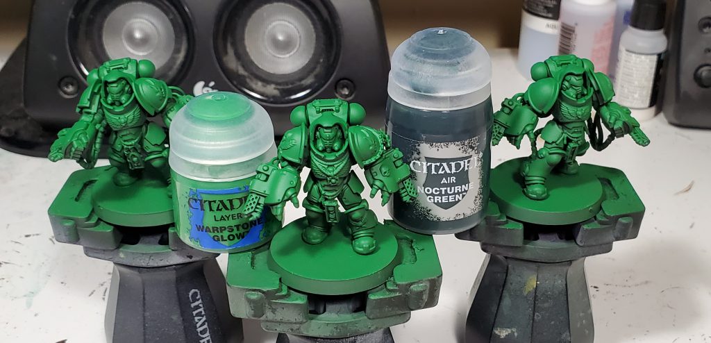 I started with a airbrush base coat of Warpstone over Nocturne, this is roughly a zenithal basecoat since I only focused the Warpstone on upper faces of the model. This is not super visible from most viewing angles, but speeds up the pin wash substantially as the darkest areas are already shaded. For the wash I used blue rather than a black to provide a slightly more natural shade. In proper colour theory, one way you can darken a colour is by mixing toward the "bottom" of the colour wheel with blue in this case. Of course that is just one method, you can also shade by working in a complementary colour for warmer shadows.