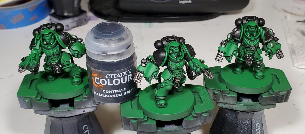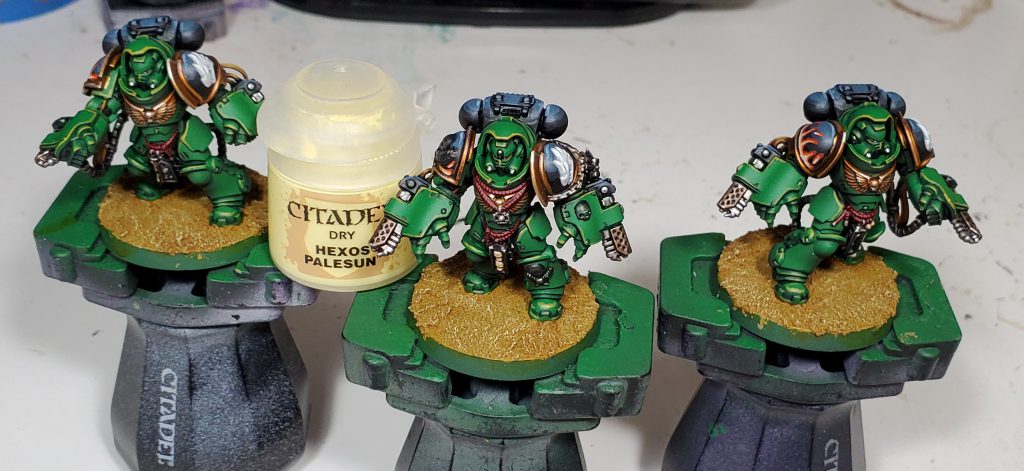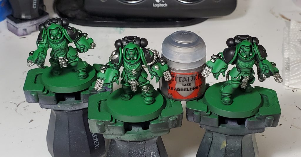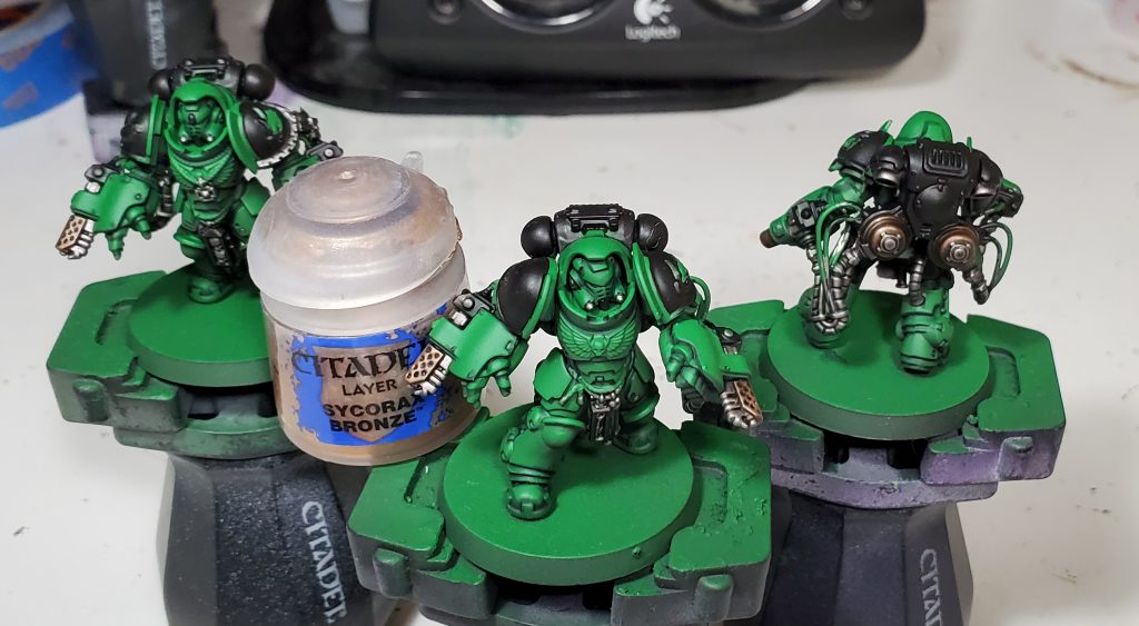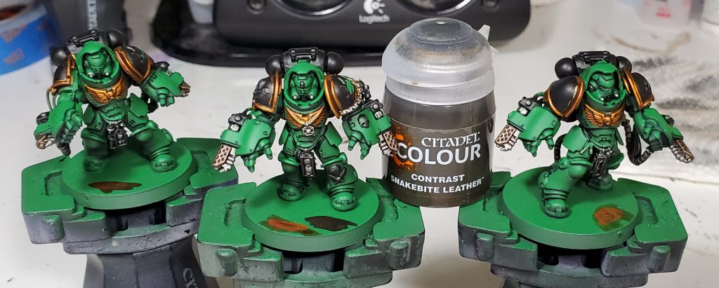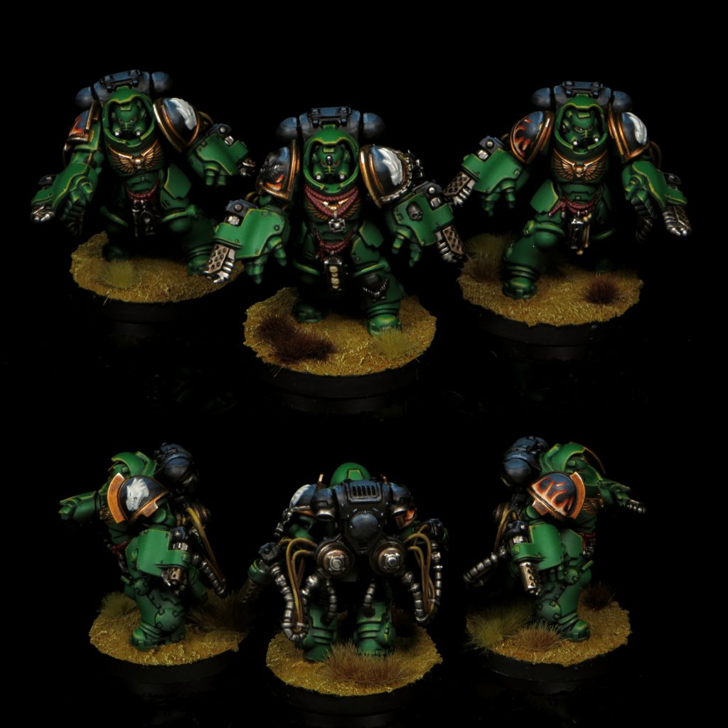 Salamanders are my second largest army after Tyranids and my scheme has gone through quite a number of iterations. This will be the 3rd revision in as many years - mind you I only started collecting this army with Dark Imperium. While the core green, black and gold retain the same base coats, I switched up washes and highlights to really bring the recipe in line with my more recent style. I think I have managed to make this new generation of Marines striking without clashing too hard when combined with the rest of my army.