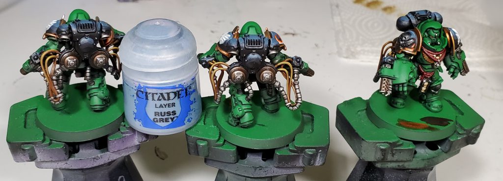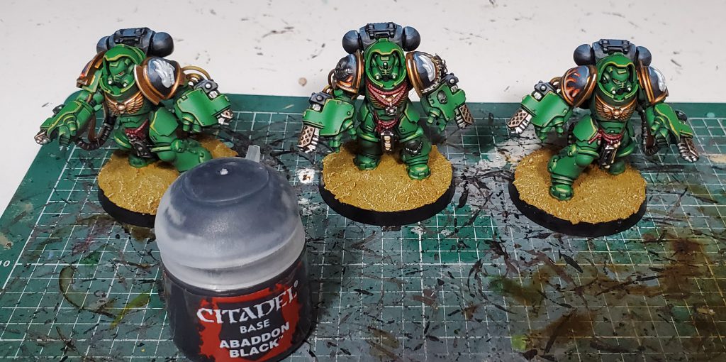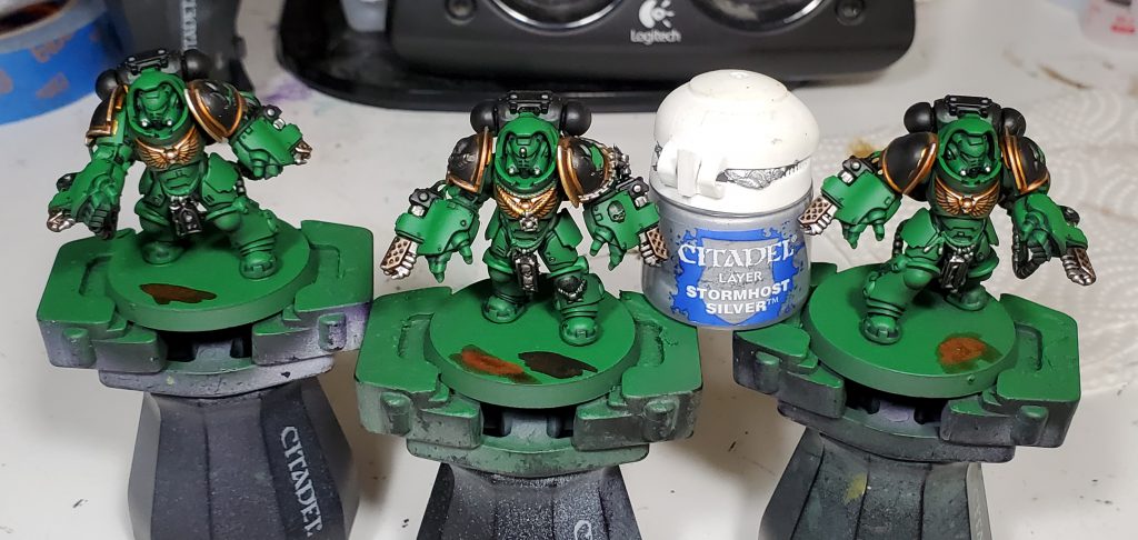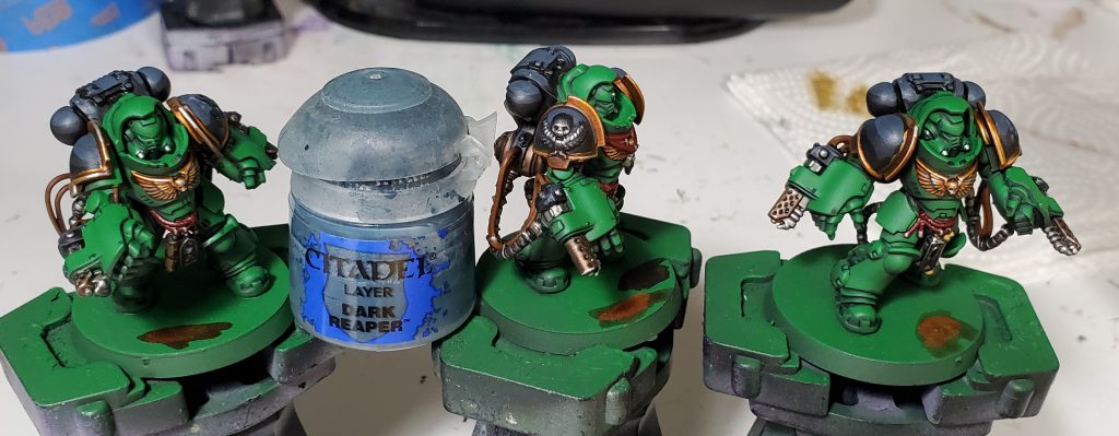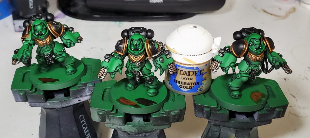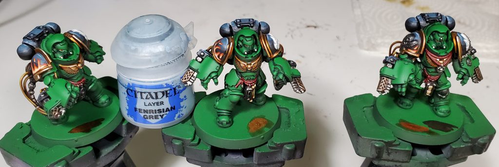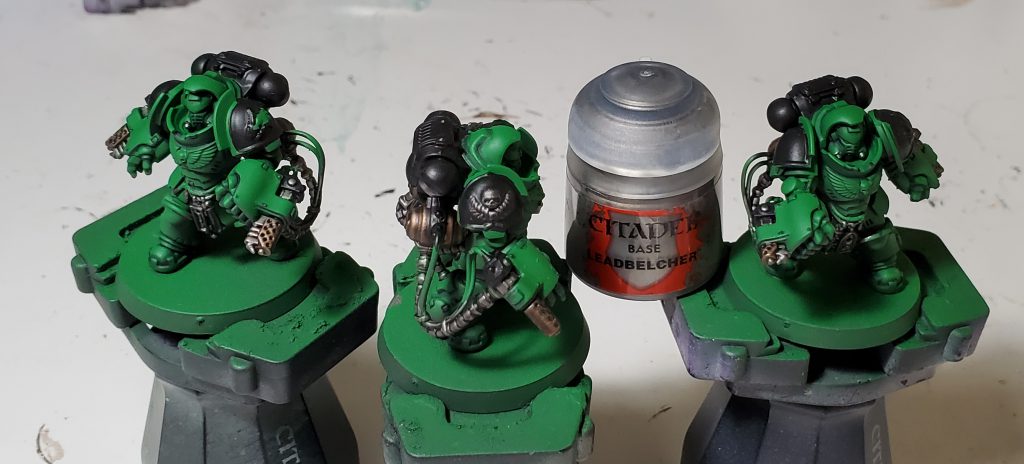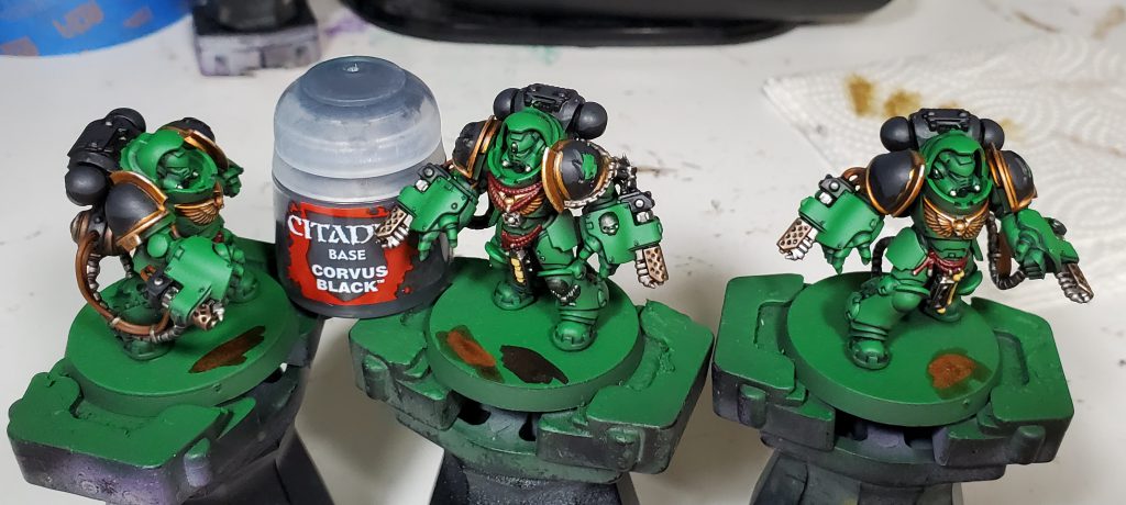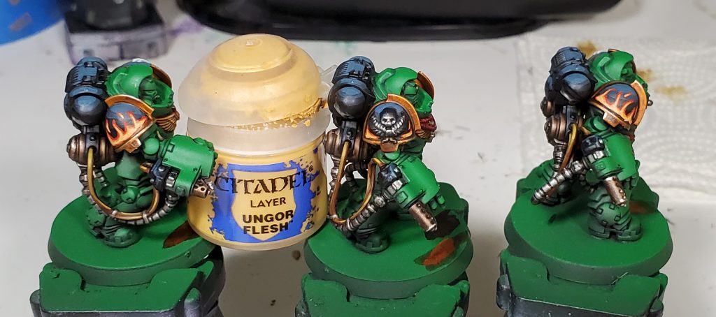 I quite like how Basilicanum Grey is basically super Nuln Oil, achieving the same kind of colour smoother and darker. An additional layer of Fyreslayer makes a delightful copper-ish colour. I nicked the idea for black metal for Salamanders from the Bladeguard that was shown off on Warhammer Community to prevent from having the gold being overbearing as was happening on previous iterations.