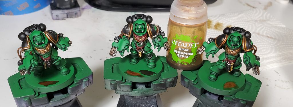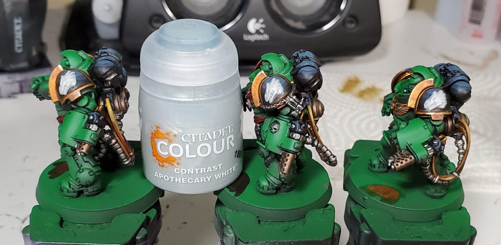 I quite like Apothecary White as it gives a decent neutral color over white but you could use pretty much any wash thinned over white depending on what you want to go for. We will come back to finish the iconography off in a bit once the wash has dried!