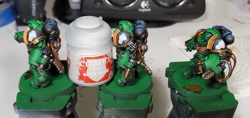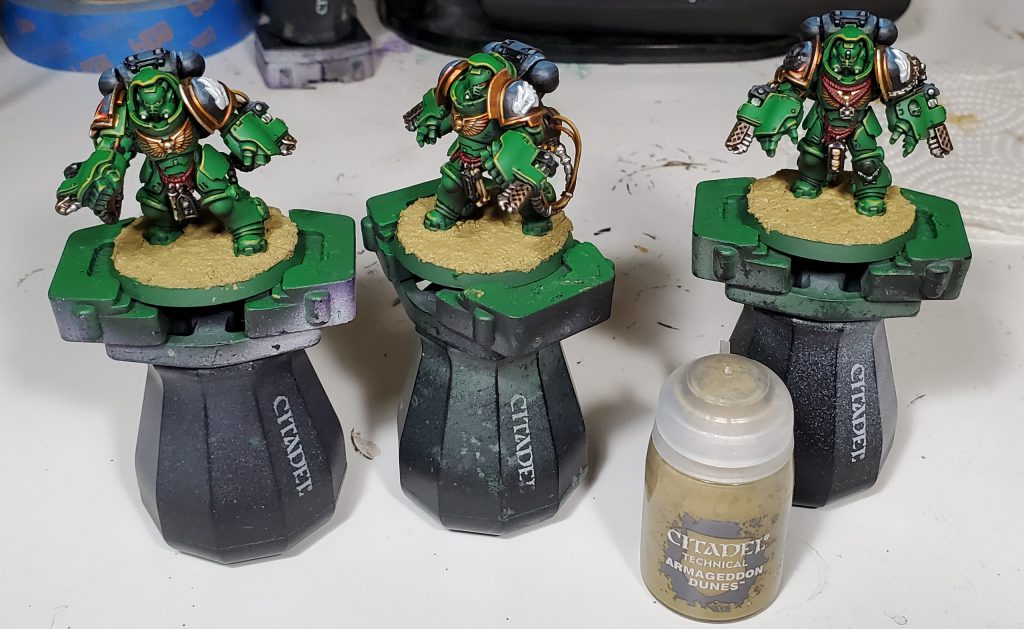 My bases on smaller models is typically fairly basic, just wash and drybrush over a texture paint before cleaning up the rims and throwing on tufts from Gamers' Grass.