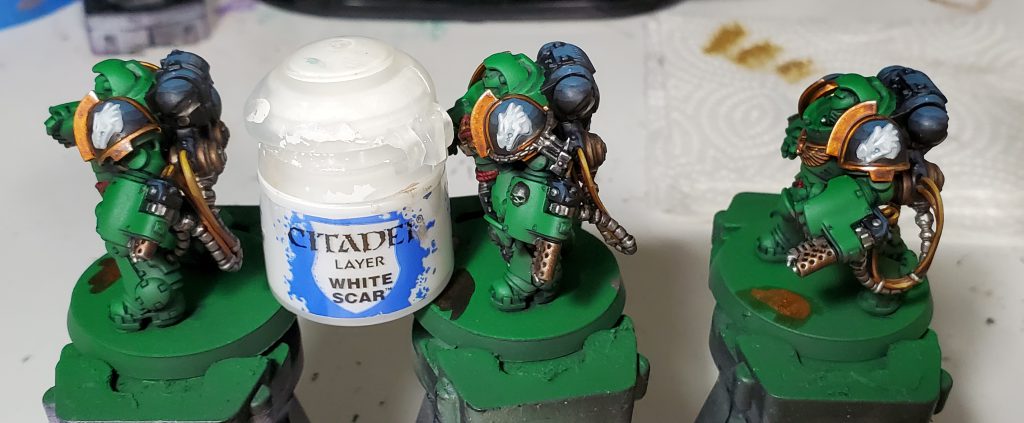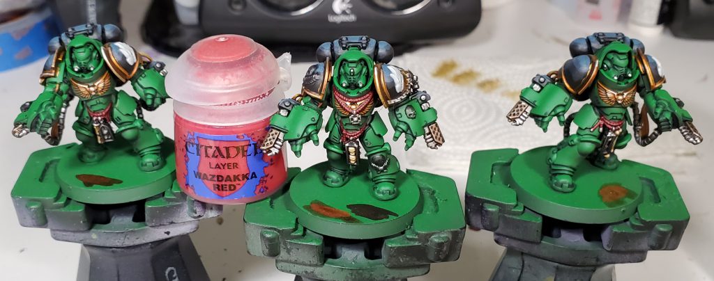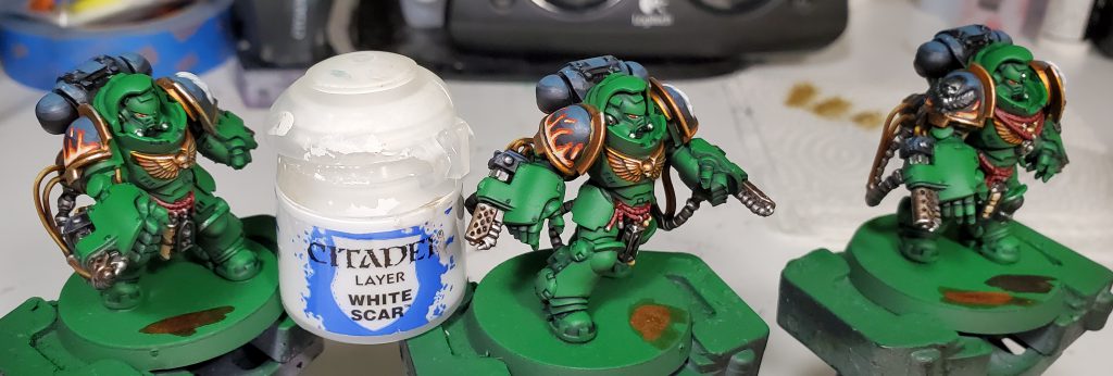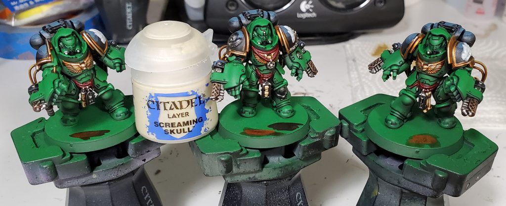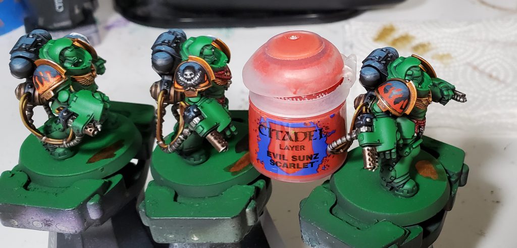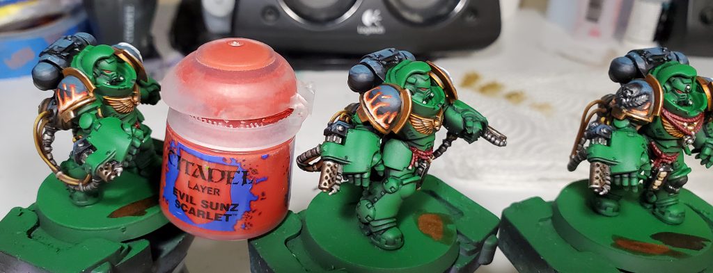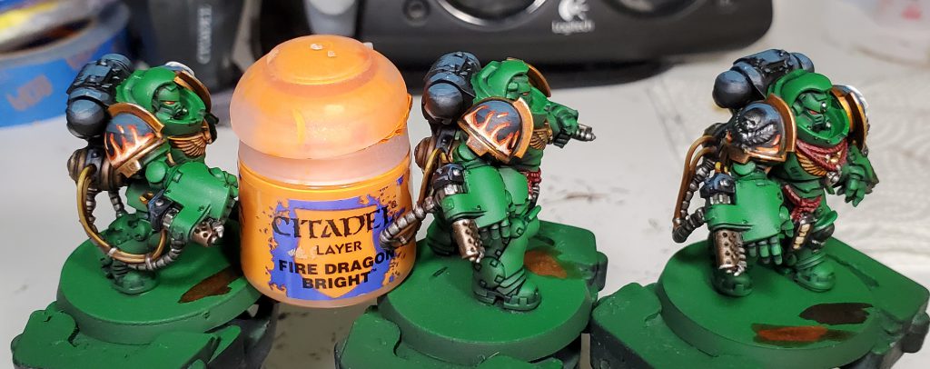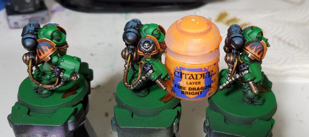 We return to finish off the iconography! I somewhat violate the my typical behavior of only doing zenithal highlights on these as I want to put a lot of emphasis on the depth of the dragon's face. For this I put the brightest points on stuff like the jaw, brows, and spines that should be be bold against the rest really to emphasize the key parts of the Salamanders logo.