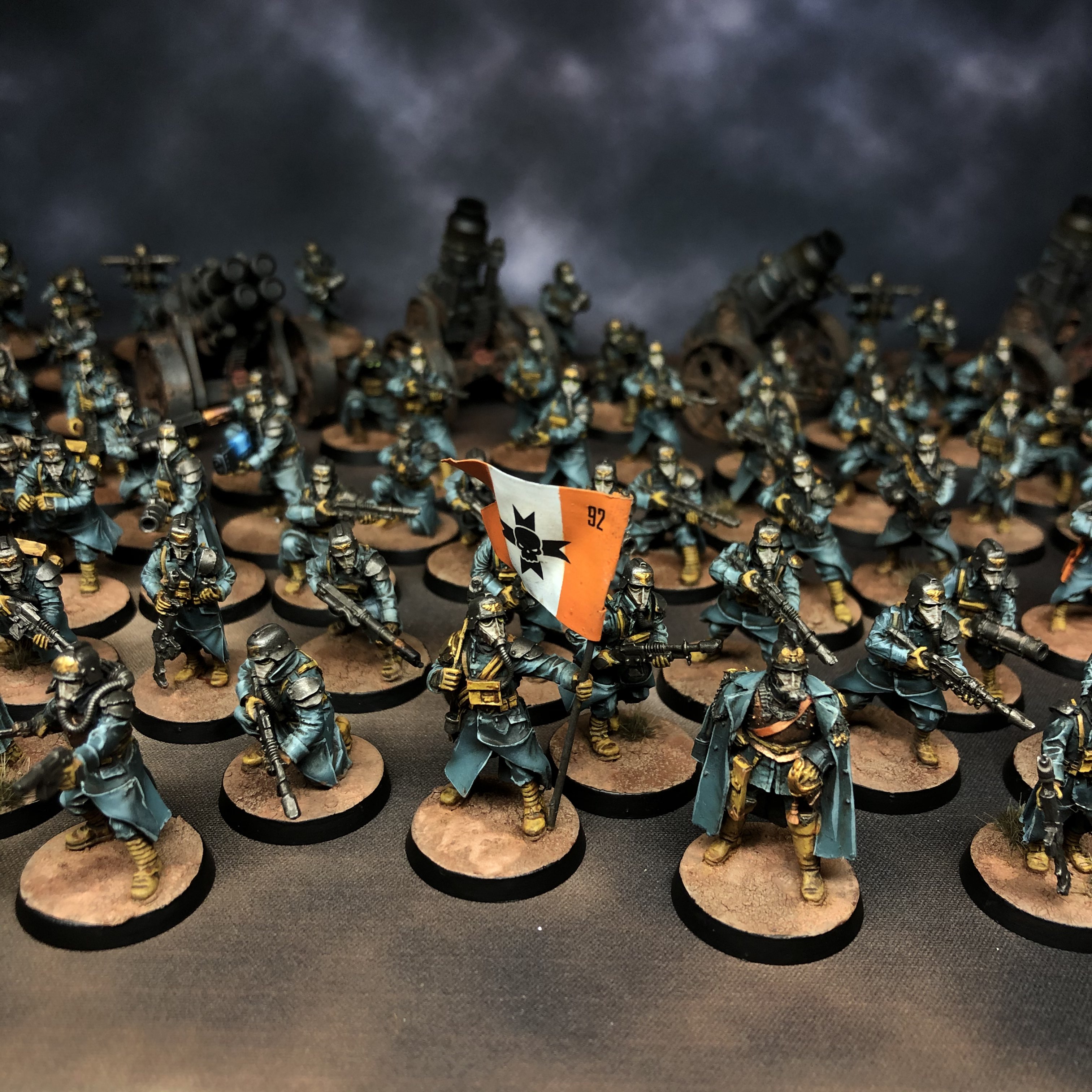 This scheme was developed as a way to paint a large number of Forgeworld resin Death Korps of Krieg models very efficiently. As much fun as that army project was, I was very glad to see Death Korps redone in glorious plastic. Efficiency, repeatability, and looking good en-masse are the keys to this scheme; which I think it accomplishes. I went with a classic blue-grey greatcoat, yellow calfskin leather, and steel detailing. The calfskin and blue-grey contrast each other well and keep the bare bones infantry squads visually distinct on the table.
