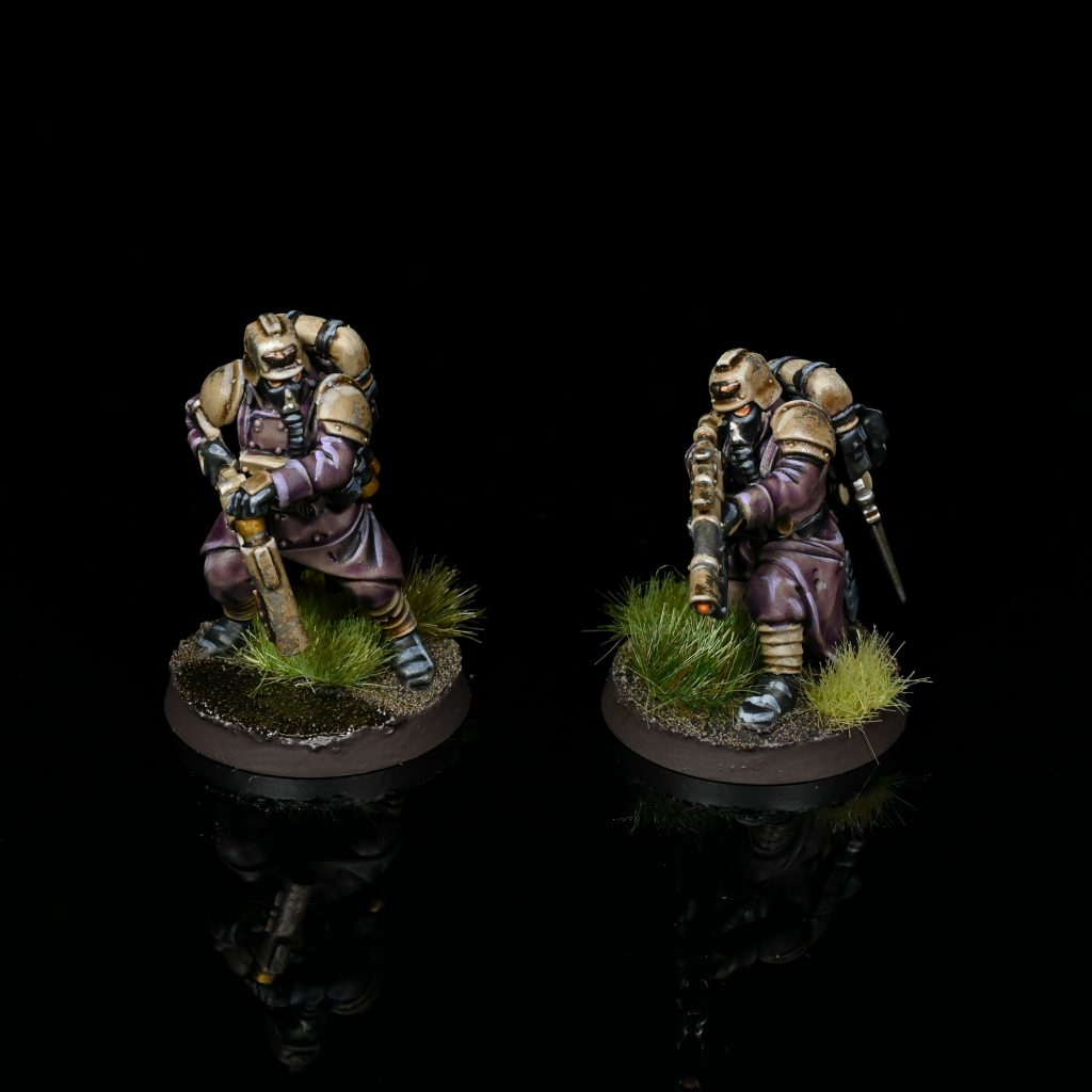 The uniforms are washed with Nuln and Druchii and the leather and rubber is washed with Black Templar.