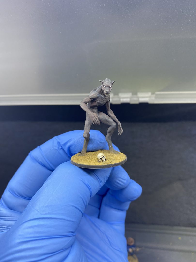 To lay out the fur patterns, I took the grey primed wolf and sprayed it with white from below (