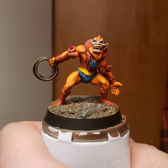 Another great figure from Quest Miniatures! I'm going for a mix of classic show appearance and first-run figure here. Prime black and apply a generous zenithal coat of white. Skin (along with the "beard"?) is Jokaero Orange, washed with Reikland Fleshshade, layered up to Troll Slayer Orange and Fire Dragon Bright. I left the helmet at Troll Slayer and brought the little forehead nub up to Fire Dragon. Boots, armor, and mane got Khorne Red, washed with nuln oil and highlighted with a bit of Wazdakka Red. The belt is Flash Gitz Yellow, with some nuln oil run into the recesses. The underoos and chest icon are painted with Thousand Suns Blue, washed wtih Nuln Oil and Highlighted with Ahriman Blue. The Rope is Wyldwood Contrast with a light drybrush of Baneblade Brown. Skin is Kislev Flesh, with a Reikland Fleshshade wash and layered back over with Kislev. Eyes were painted white and glazed with a