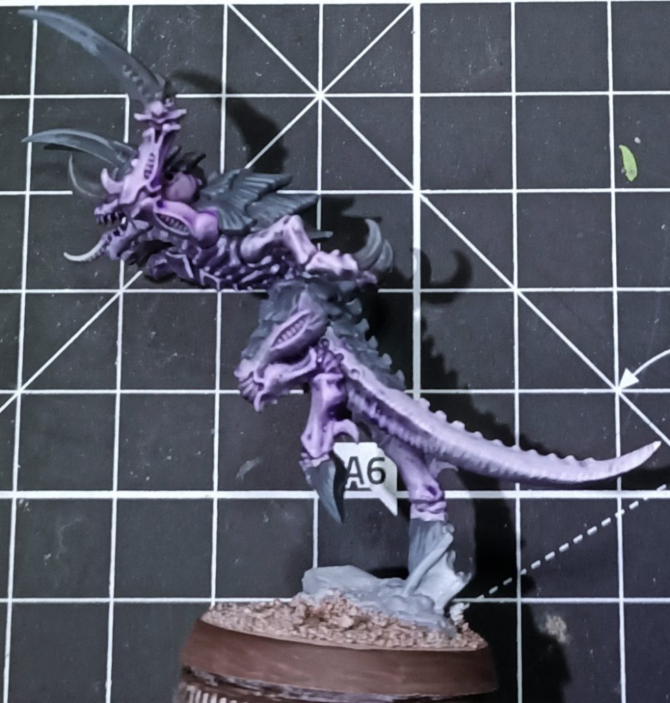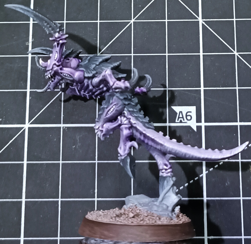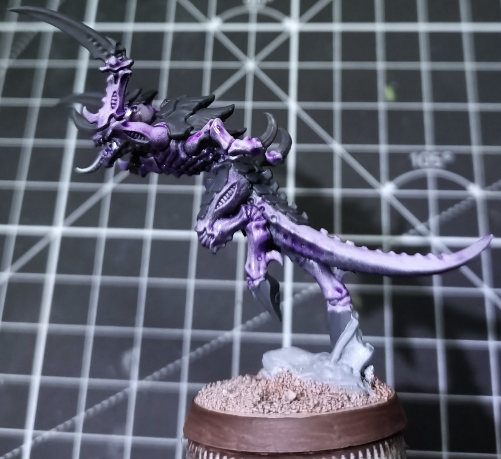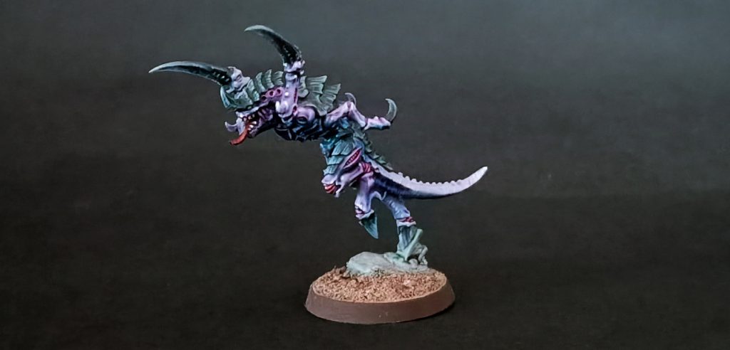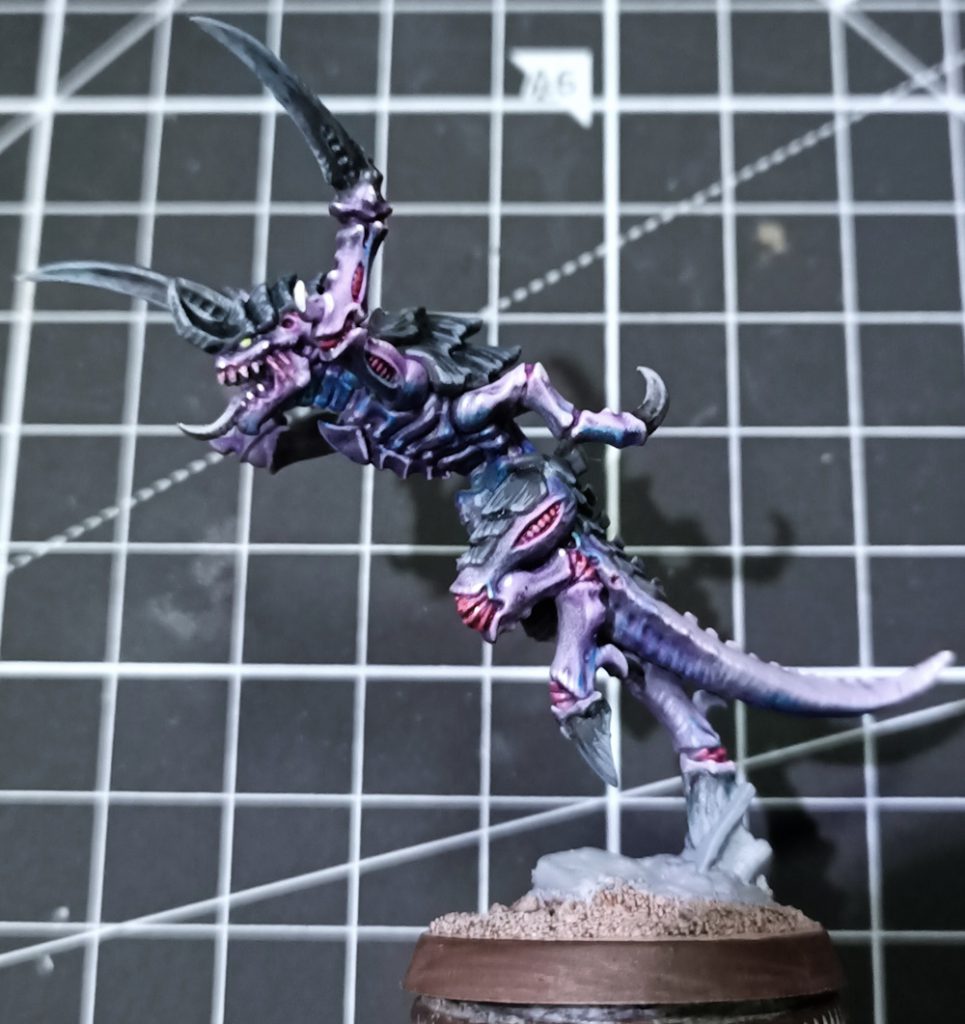 Paint the eyes yellow (good contrast with purple), use Volupus Pink to wash the muscle divots, and water it down (yes, water not contrast medium) and wash a very small amount of it into the jaw muscles and where the gums meet the teeth. Use Talassar Blue sparingly as a diluted (water or contrast medium , doesn’t matter) wash for the underside of the model, you want this blue to accent the purple but not overwhelm it (My photos are perhaps a little saturated, it looks a lot more intense here than it does in real life). Additionally, step your Chitin/Claw grey highlight up another level and do another layer of highlights, this should be a very light grey but not pure white. As a final step, use Black Templar contrast to wash the claws/chitin plates, with an emphasis on letting it pool in the recesses rather than darkening your highlights.