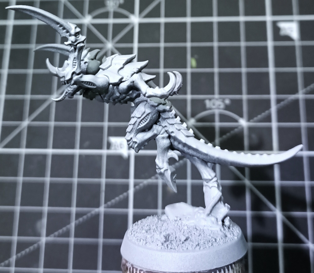 For the flesh, either add more white to your purple highlight colour or just go straight to an off-white (Pallid Wych Flesh or Vallejo’s Silver Grey (70.883), which is my Secret Sauce for all painting) and do a little point-work here and there (just to emphasise points of articulation or the play of light on the model). For Chitin/Claws, just do another edge highlight with a lighter grey on a reduced area (you want to communicate a gradient of highlights), I also add a little hatching here and there for texture on the claws). Additionally, use a white or off-white to do the teeth, eyes and those ‘muscle divots’ you can see on the arms and legs.