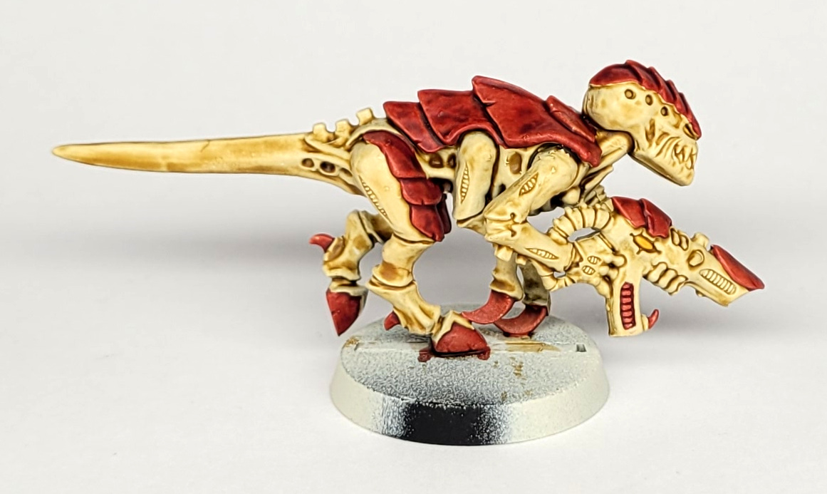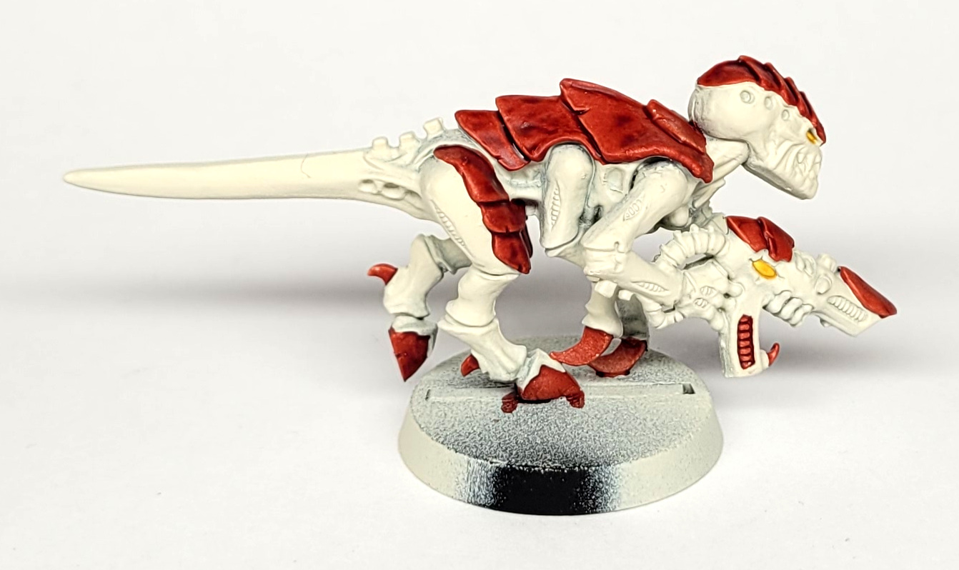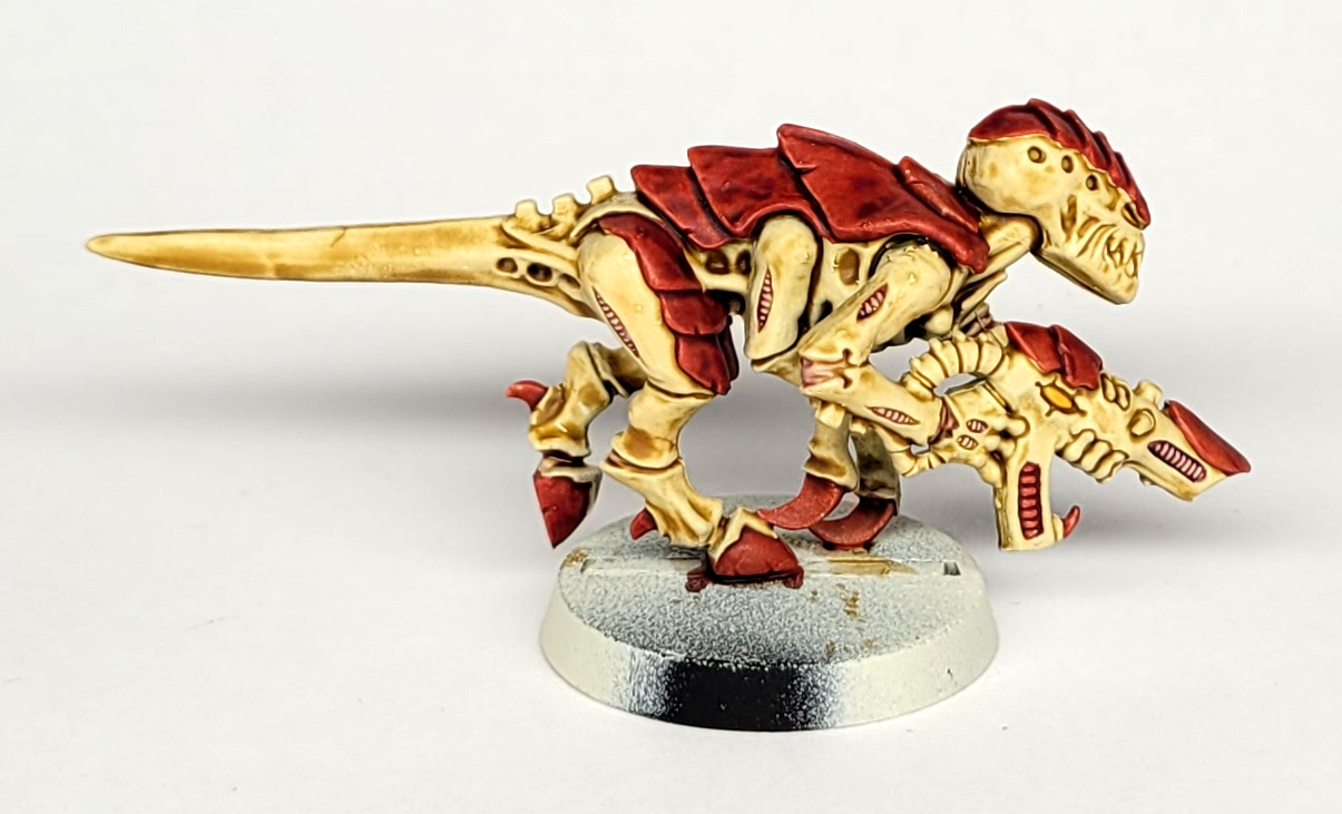 Paint all chitin armour, blades and claws Flesh Tearers Red. I experimented with the teeth too but they looked odd so, counterintuitively, they are left Wraithbone.