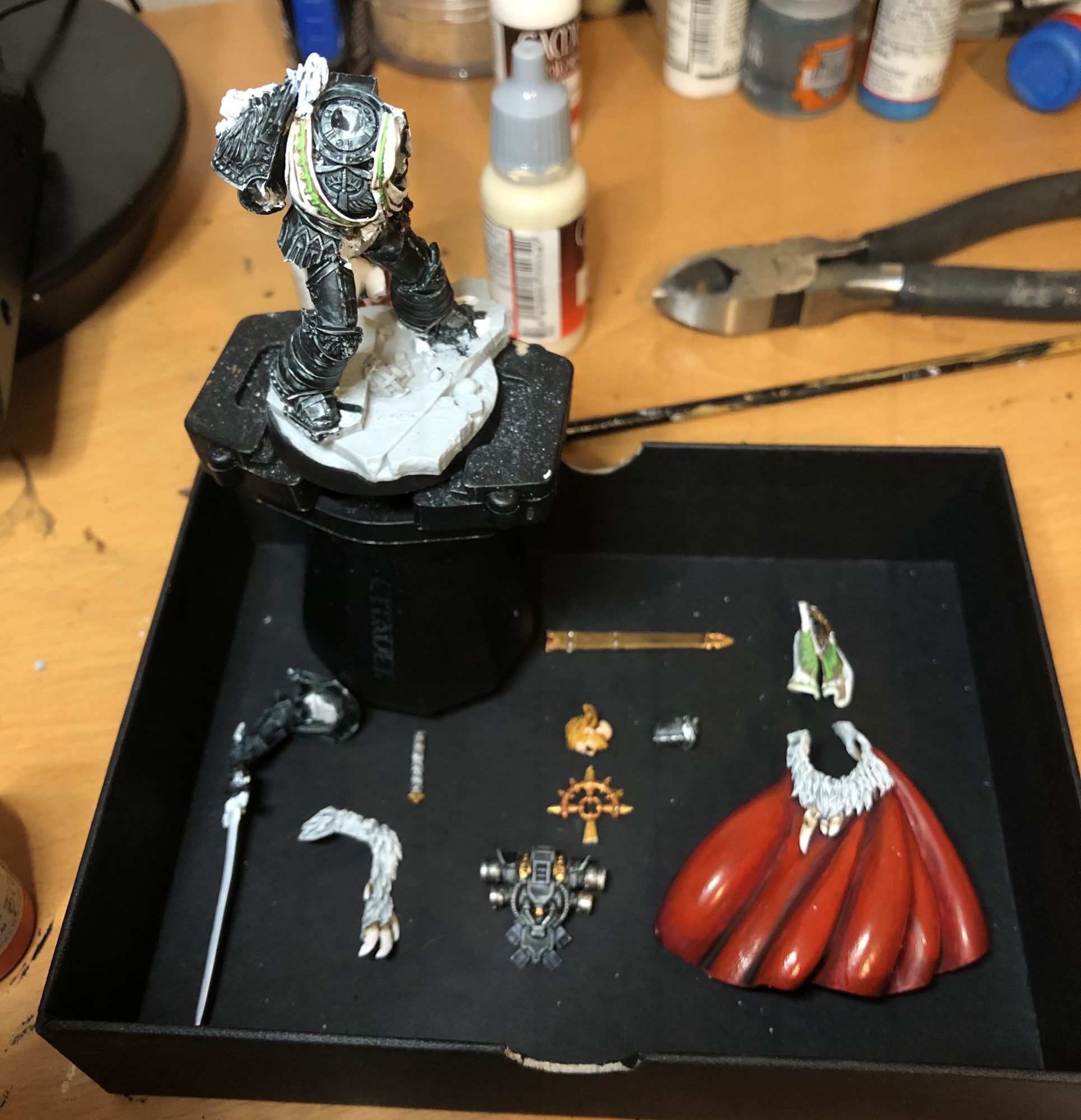 - Cape: I don't love the VGC reds! But they're also all I have, so here we are. Basically this is the technique from the white robes, but the colors from the red logos, and due to the size of his enormous cape and the less-than-amazing paint coverage, it took approximately one hundred hours. Gory, Bloody, Agrax, Bloody, and then a tiny amount of Hot Orange on the hem and the logos/stitching in the corners. I didn't punch this up as much as the other reds because I wanted it a little more muted, but it resulted in a nice deep red.