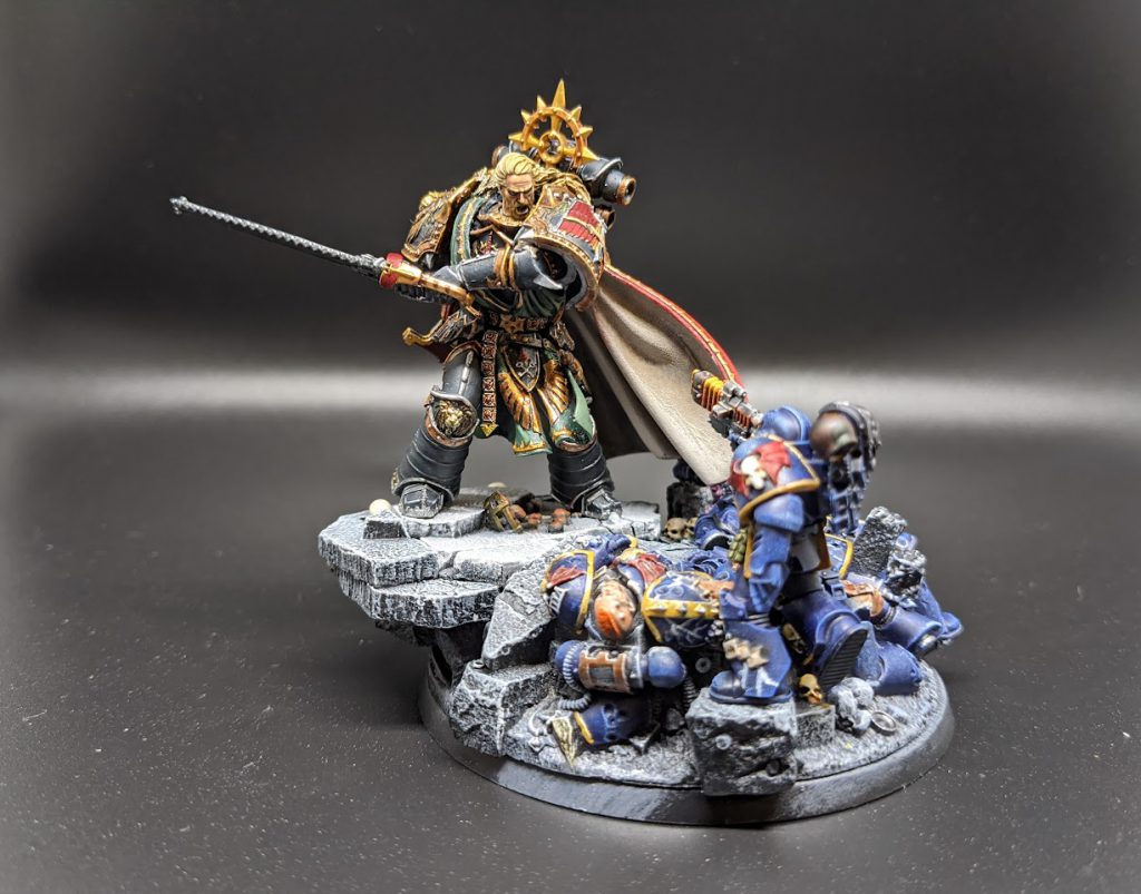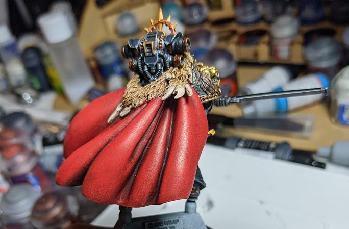 The golds on the robes were Retributor Armor washed with Druchii Violet, and highlighted with Liberator Gold. The Gold on the armor was Balthazar Gold washed with Cryptec Armorshade Gloss, and highlighted with Liberator.